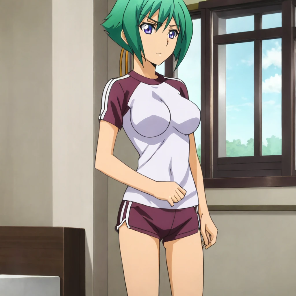 Trigger with sports outfit: ZessicaSports, 1girl, green hair, short hair, purple eyes, raglan sleeves, medium breasts, hair ribbon, shorts, cowboy shot