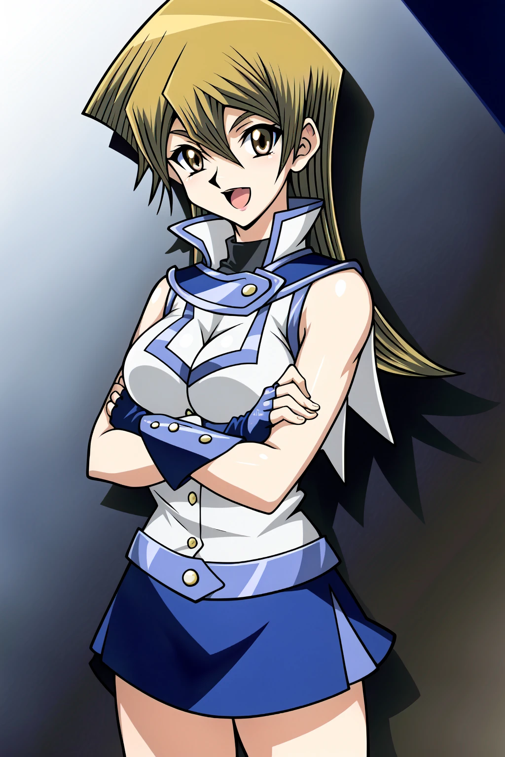Alexis Rhodes, 1girl, tenjouin asuka, solo, long hair, skirt, gloves, duel academy uniform (yu-gi-oh! gx), fingerless gloves, blonde hair, brown eyes, blue skirt, sleeveless, hand on hip, miniskirt, blue gloves, shirt, smile, jacket
