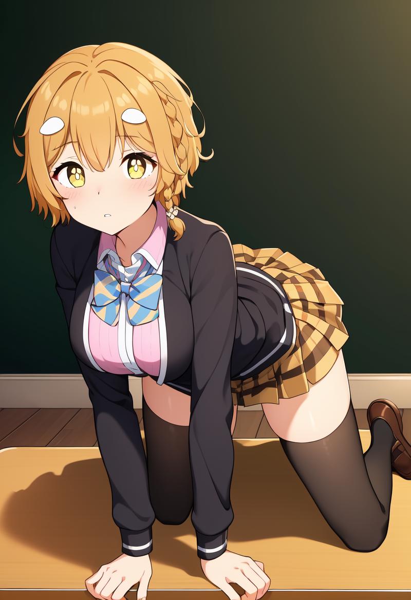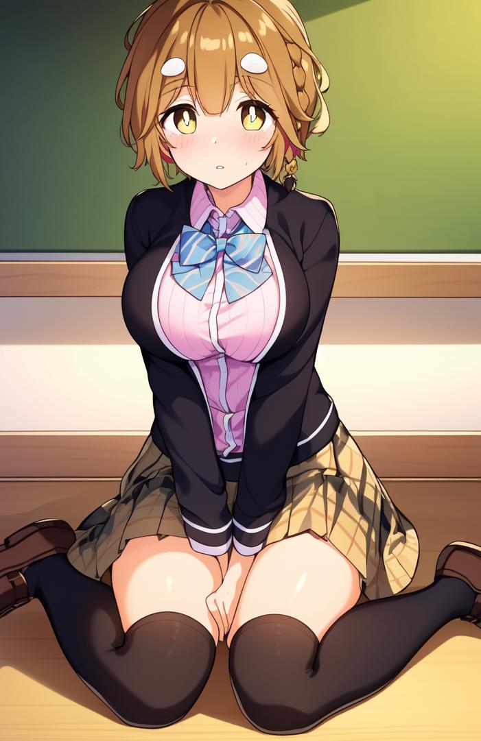Recommended prompts: koiwai_yoshino, 1girl, solo, brown hair, braid, single braid, short hair, yellow eyes, white pupils, hair ornament, (white hair ornament), large breasts, jacket, black jacket, shirt, pink shirt, striped shirt, long sleeves, bow, blue bow, bowtie, blue bowtie, stripped bow, stripped bowtie, plaid skirt, thighs, thighhighs, black thighhighs, shoes, school shoes, blush, parted lips