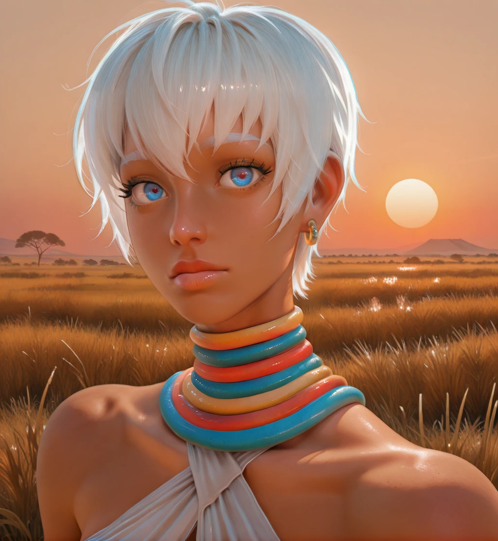 criss-cross halter, or halterneck, white bikini, or white underwear, or jewelry, neck rings, armlet, anklet, barefoot,