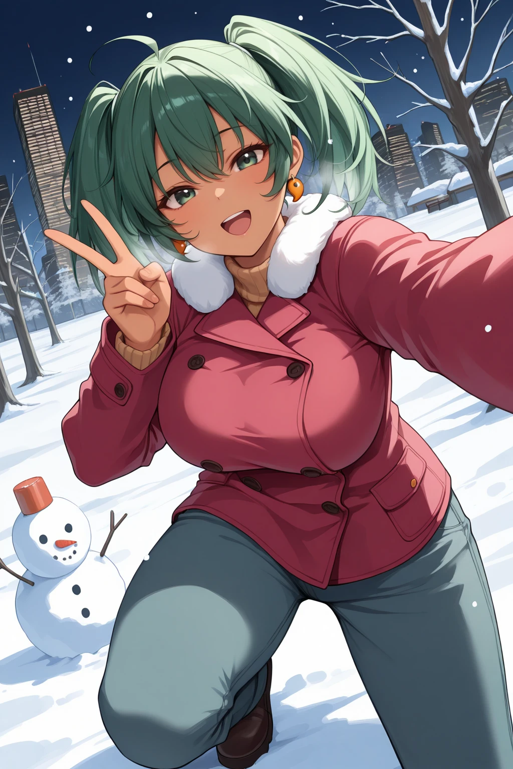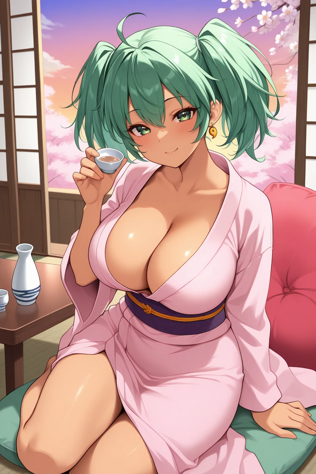 h0us3n, dark-skinned female, large breasts, green eyes, green hair, medium hair, ahoge, hair between eyes, twintails, magatama earrings