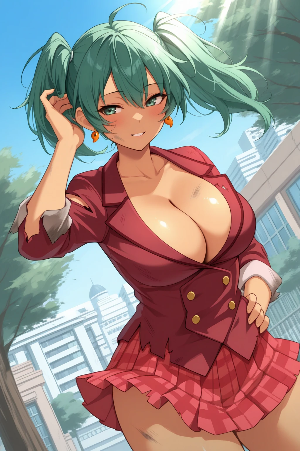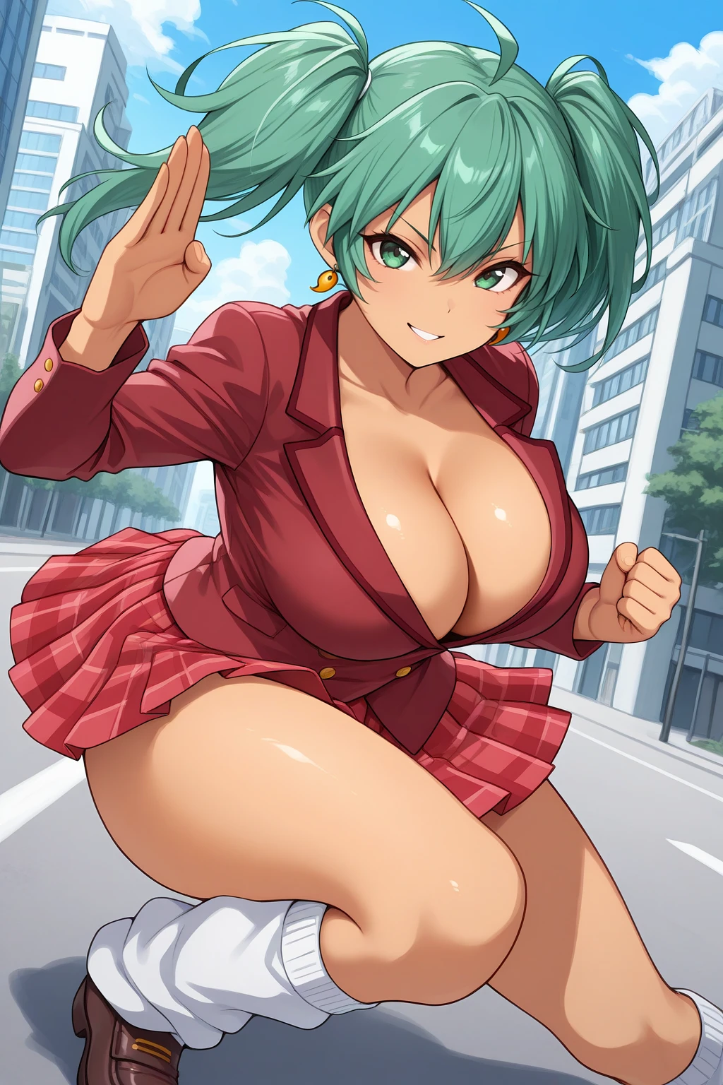 red jacket, cleavage, red skirt, pleated skirt, plaid skirt, miniskirt, white leg warmers, brown shoes