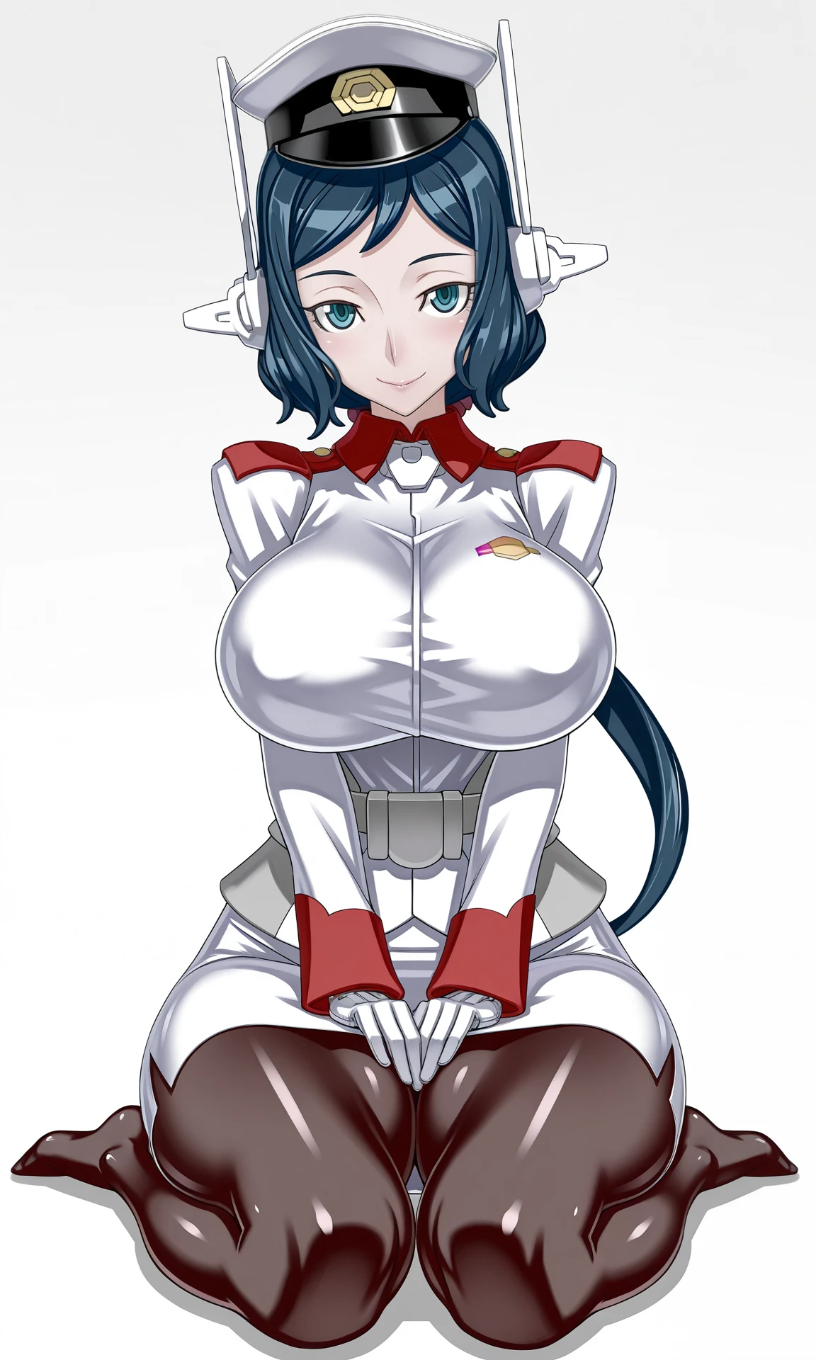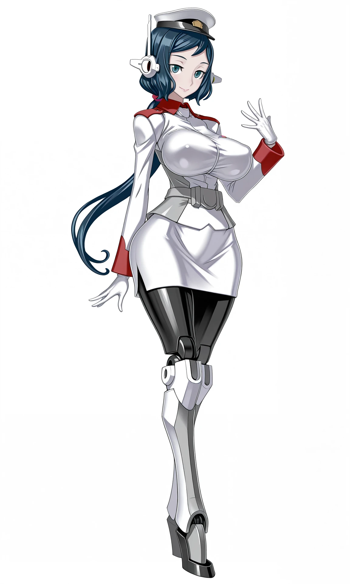 blue hair, hat, military, uniform, blue eyes, gloves, long hair, pantyhose, skirt, military uniform, ponytail,low_ponytail,long_sleeves,white_gloves,mechanical_ears,white_skirt,pencil_skirt,black_pantyhose,