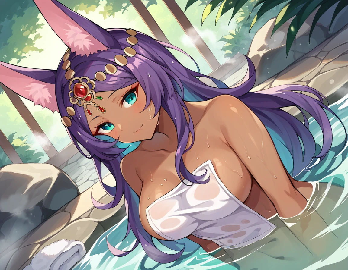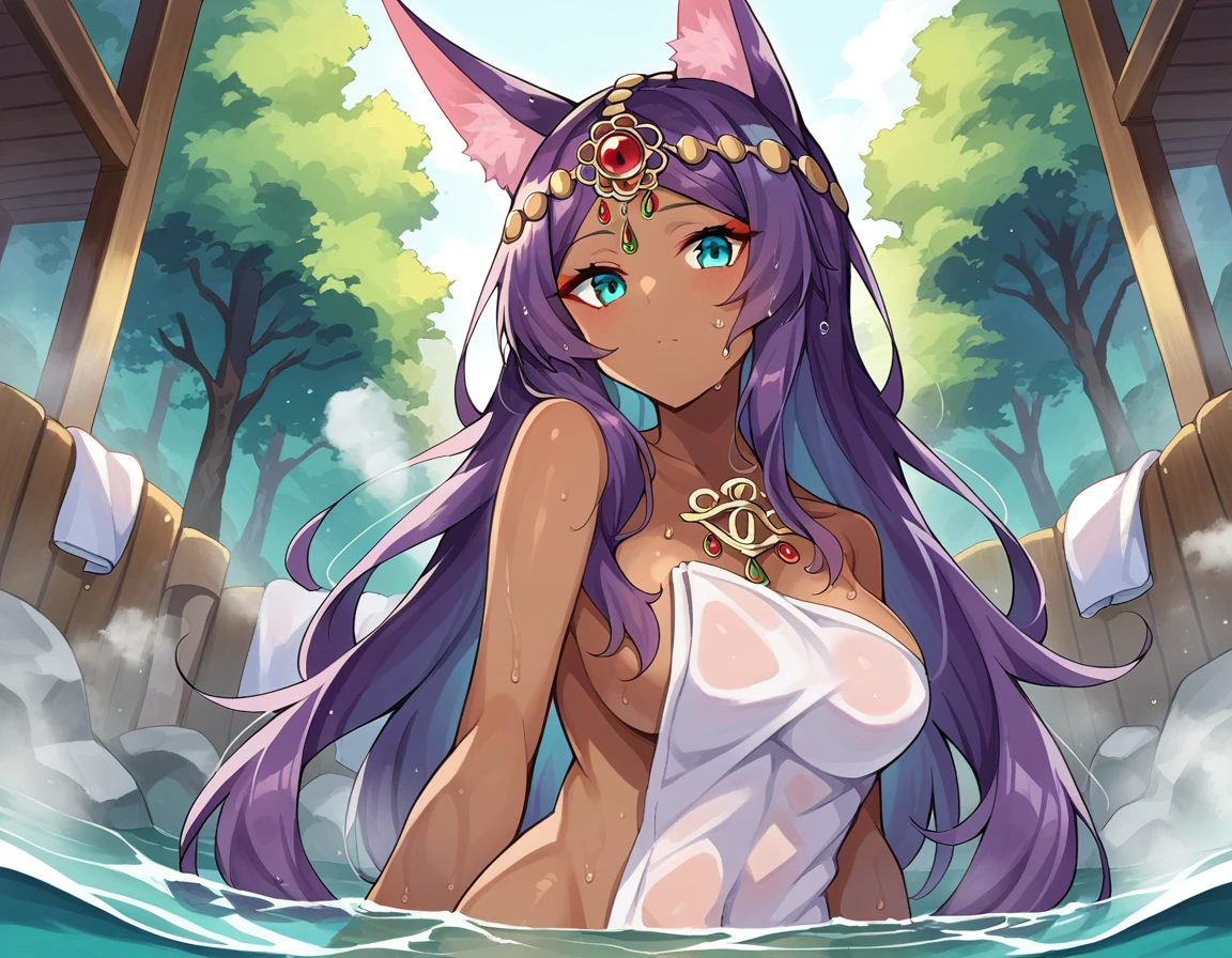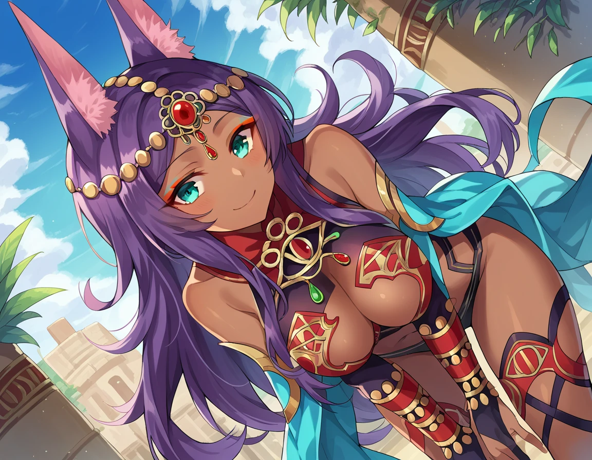 queen of sheba, animal ears, aqua eyes, dark skin, dark-skinned female, forehead jewel, gem, jackal ears, purple hair,