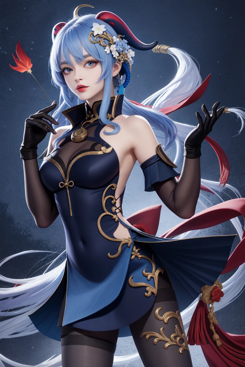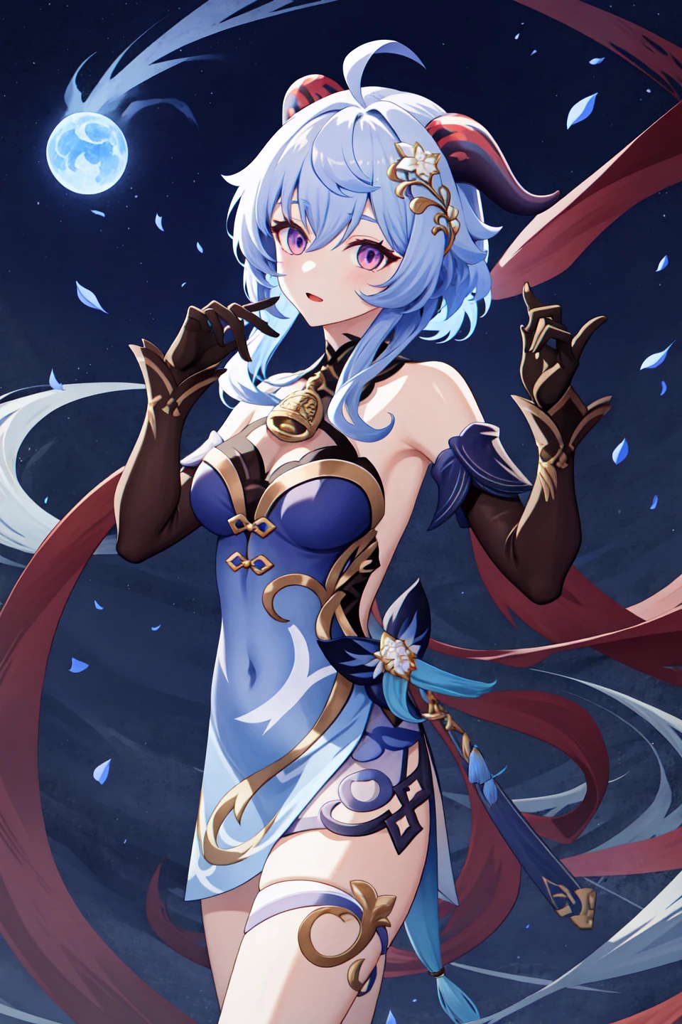 ganyu \\\(genshin impact\\\) \\\(cosplay\\\),ganyu \(genshin impact\),horns,blue hair,ahoge,bangs,purple eyes,detached sleeves,sidelocks,bare shoulders,long hair,bell,hair ornament,gloves,alternate costume,black gloves,dress
