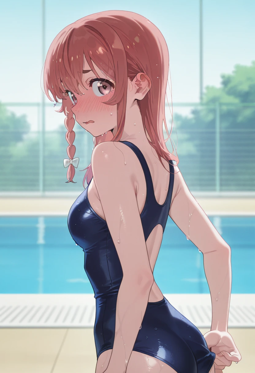 1girl, solo, long hair, red hair, pink eyes, single braid, thick eyebrows, side braid, hair bow, medium breasts,