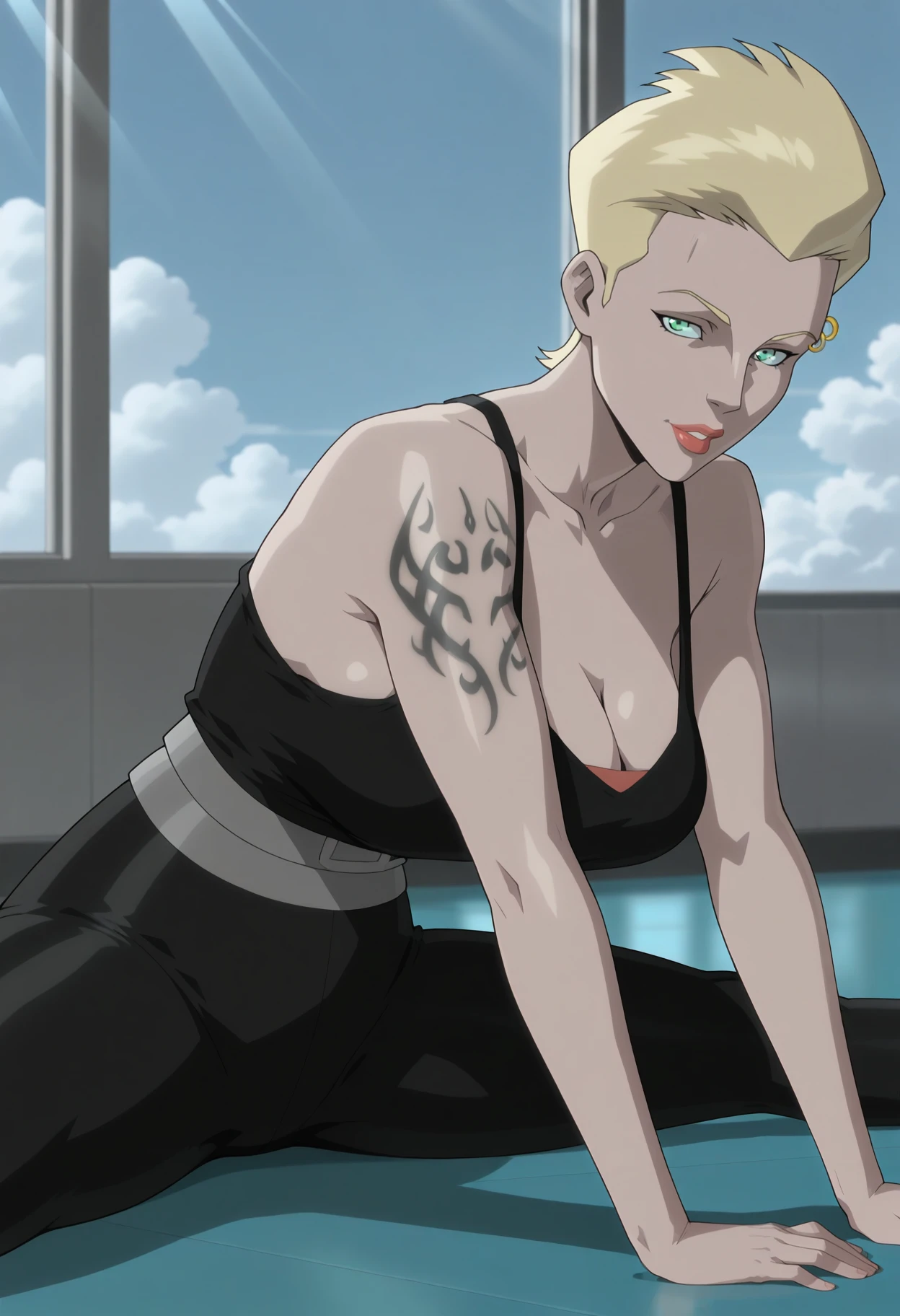 arm tattoo, cleavage, black tank top, black leggings,Description