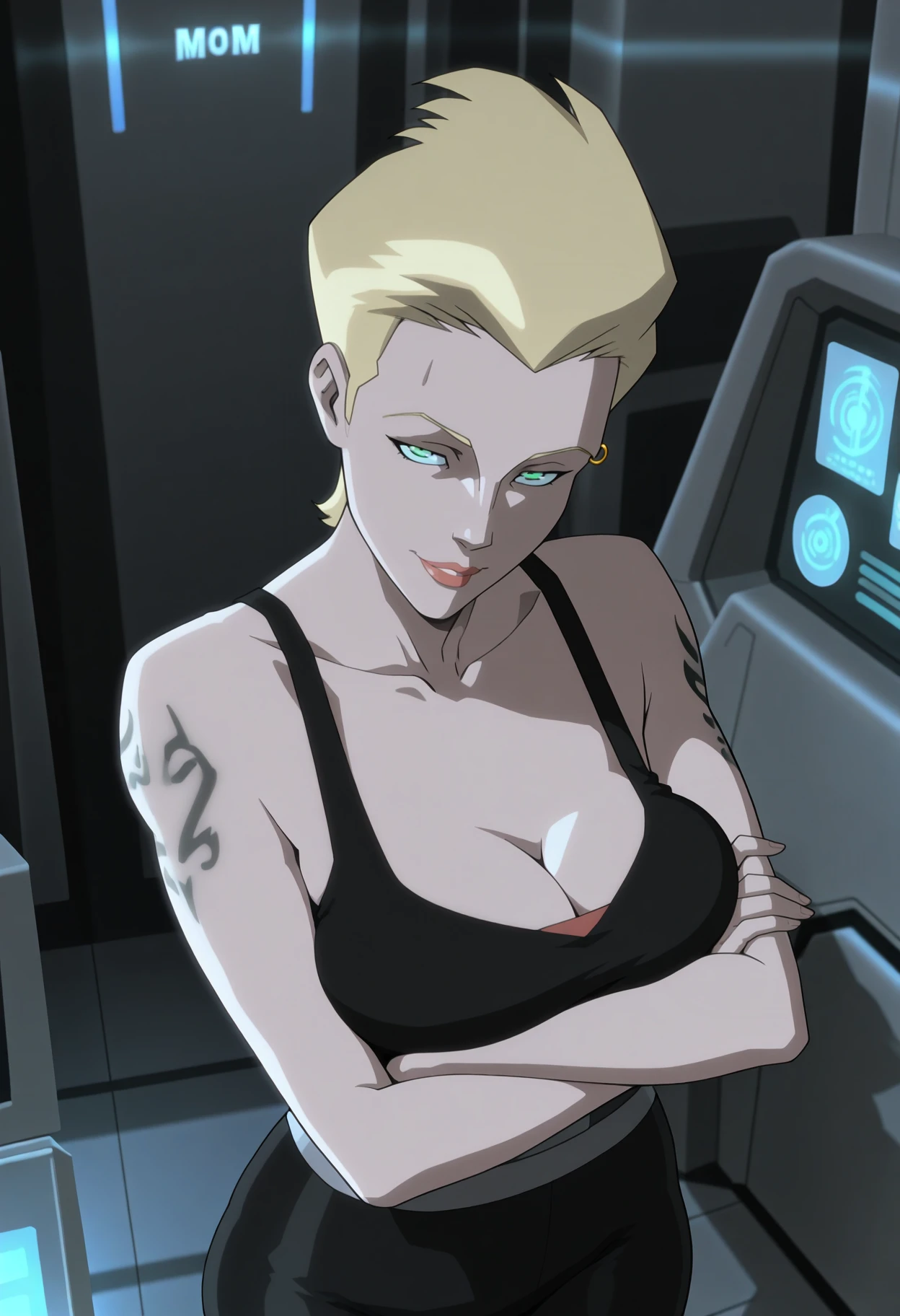 DSARin, 1girl, blonde hair, short hair, green eyes, eyebrow piercing, breasts, Outfit