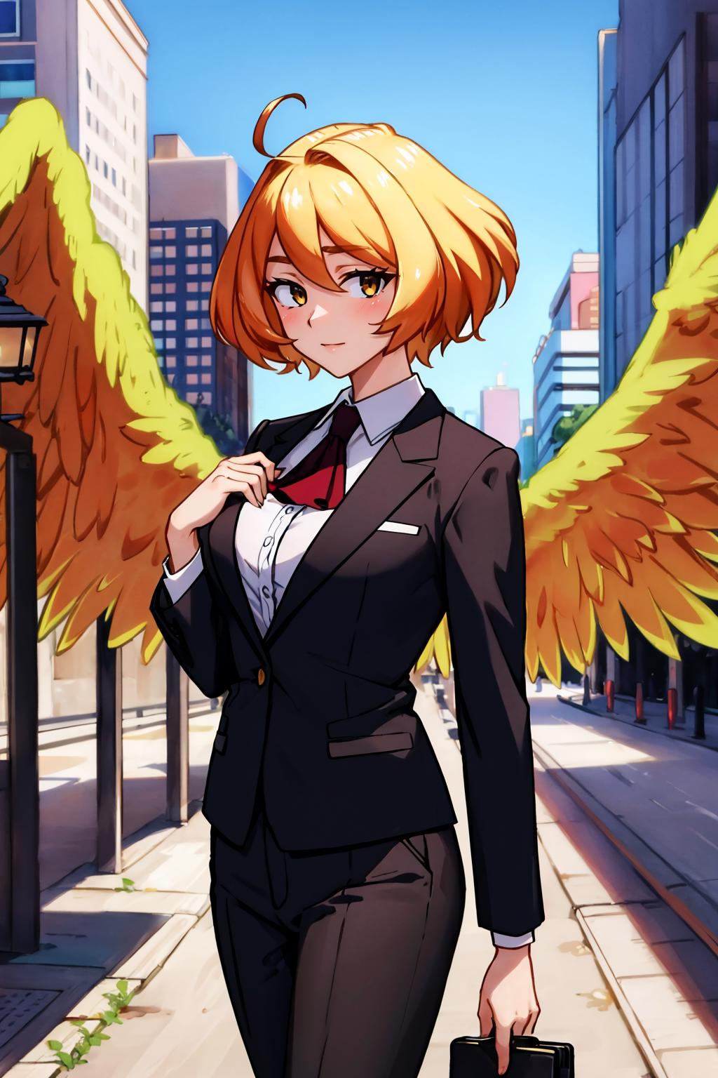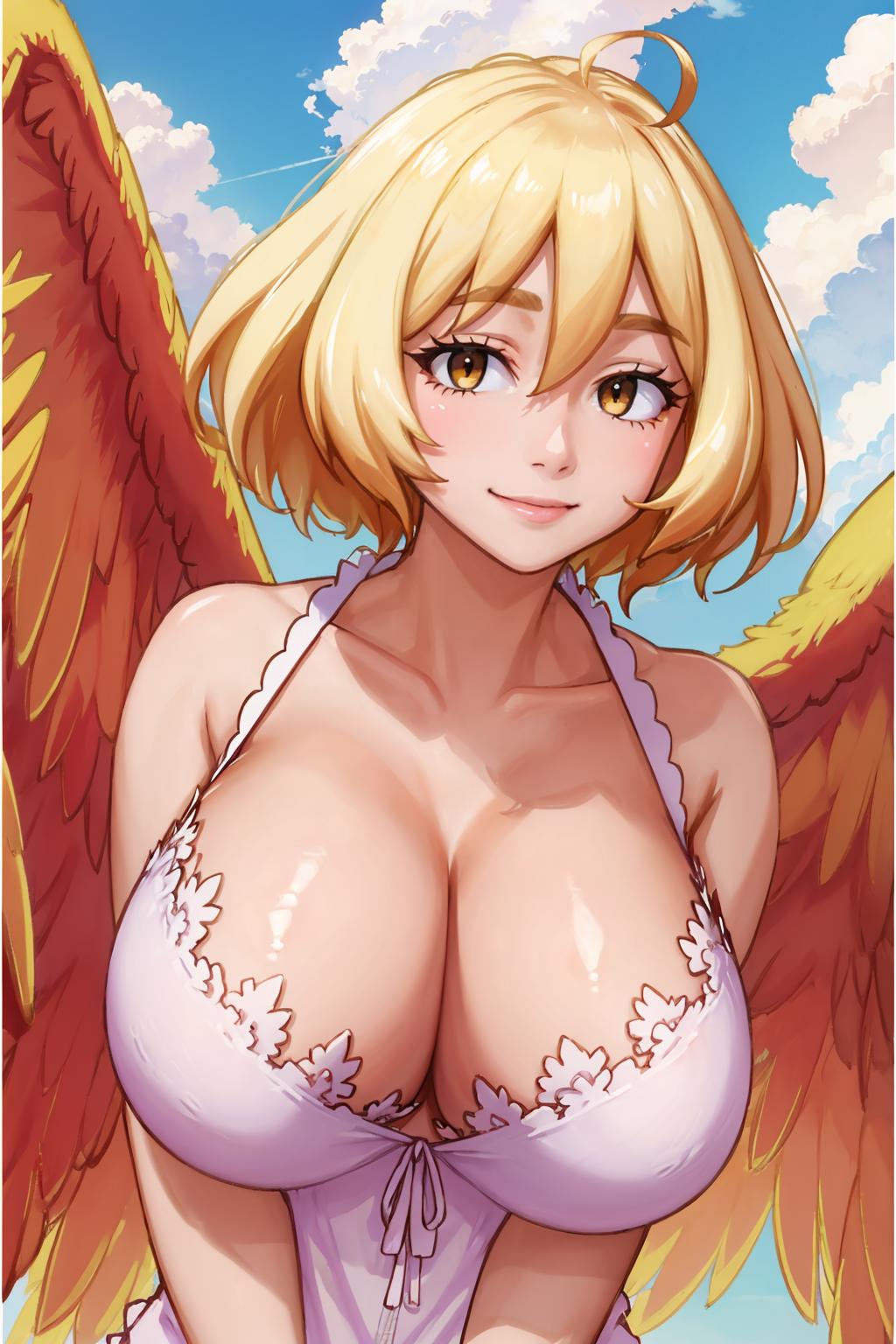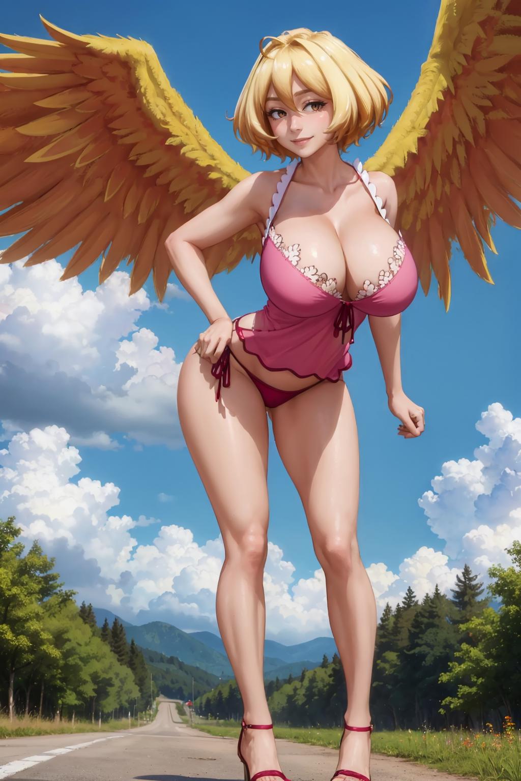 Add "yellow wings, camisole, pink panties, cleavage, huge breasts" for her typical look.