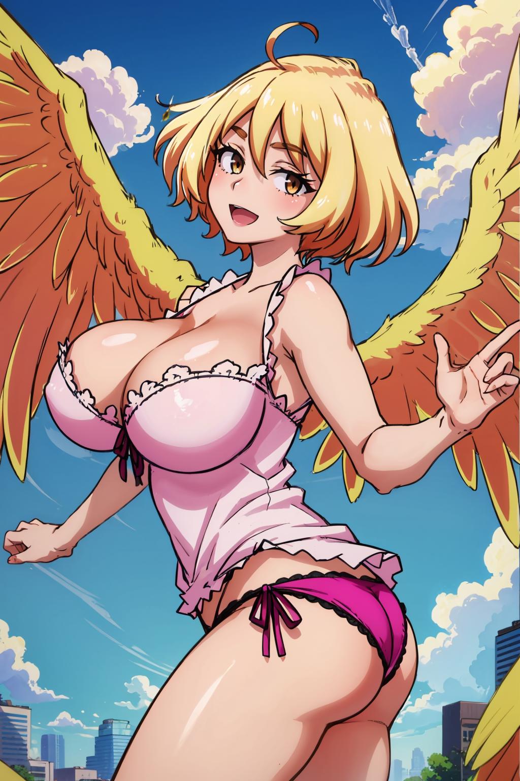 yellow wings, camisole, pink panties, cleavage, huge breasts