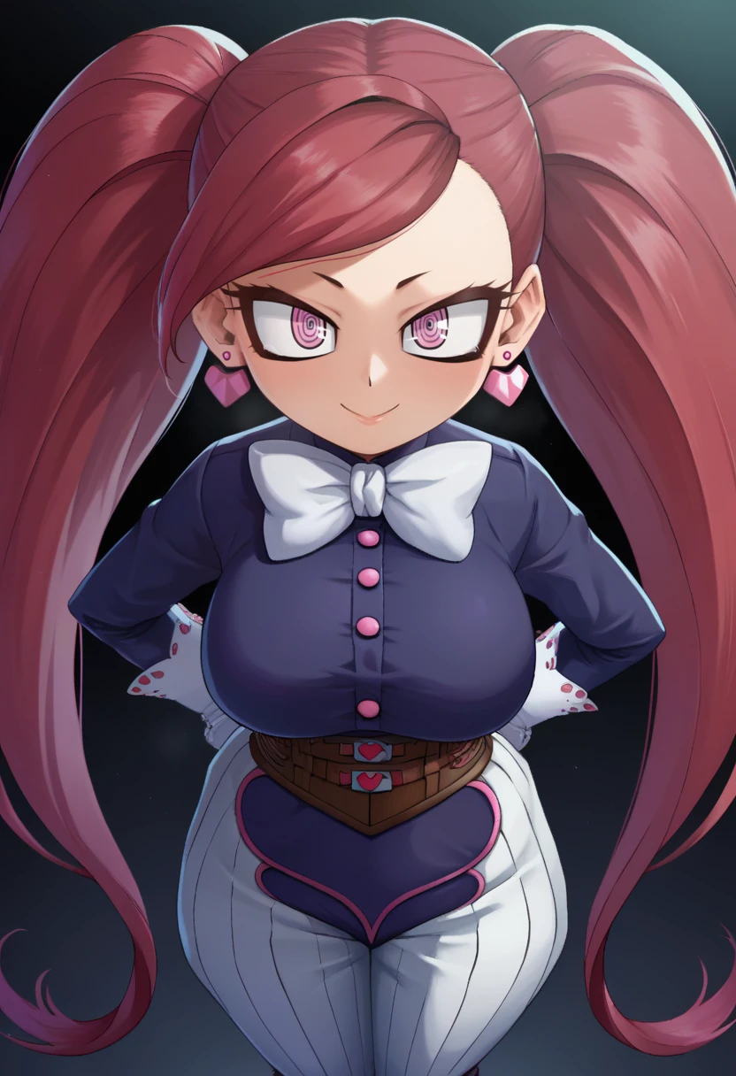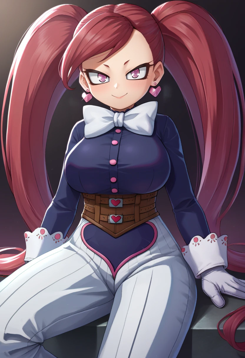 labravaSDXL, long hair,smile,long sleeves,bow,twintails,jewelry,very long hair,heart,red hair,earrings,pants,white gloves,bowtie,pink eyes,buttons,white bow,corset,white pants,heart earrings,white bowtie,large breasts,thighs,