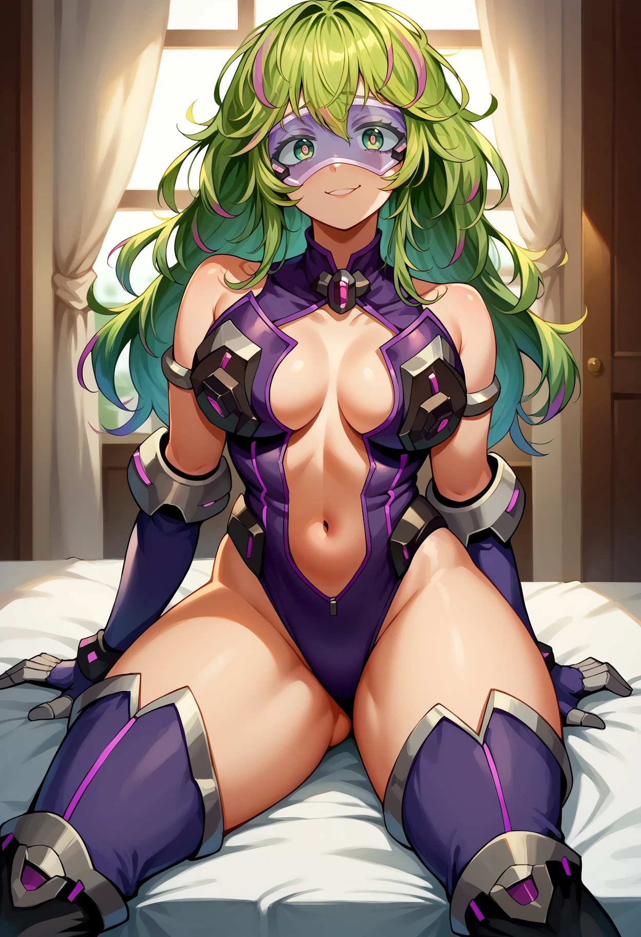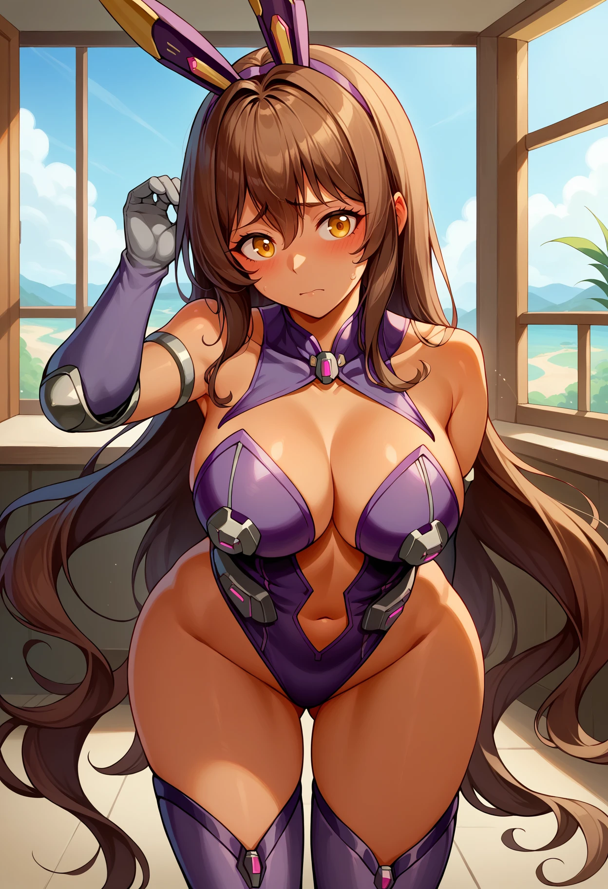 head-mounted display, holding weapon, collared leotard, purple leotard, center opening, armlet, elbow pads, detached sleeves, long gloves, grey gloves, thigh boots, purple boots