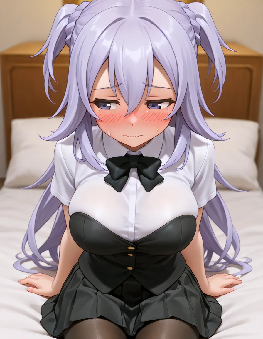 There is no activation word. The main tags are 1girl, purple eyes, purple hair, long hair, hair between eyes, two side up, sidelocks, large breasts