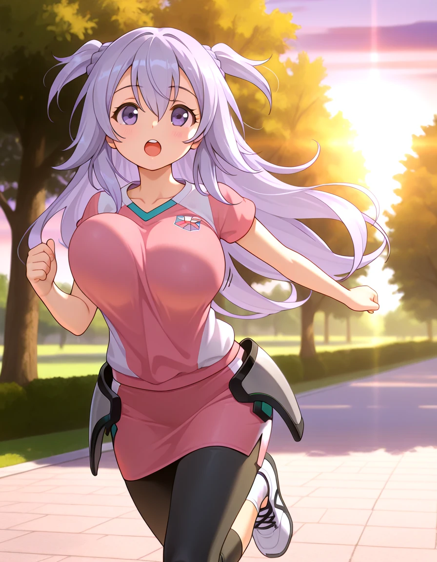 pink jersey, short sleeves, collarbone, button badge, pencil skirt, hip armor, black leggings, white socks, sneakers