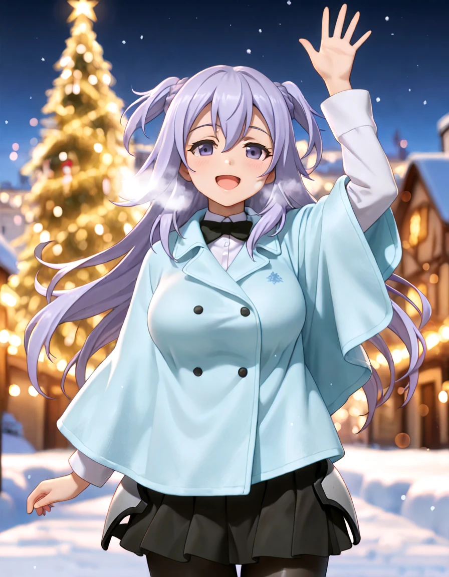 aqua poncho, white shirt, long sleeves, black bowtie, black skirt, pleated skirt, hip armor, black pantyhose, white boots