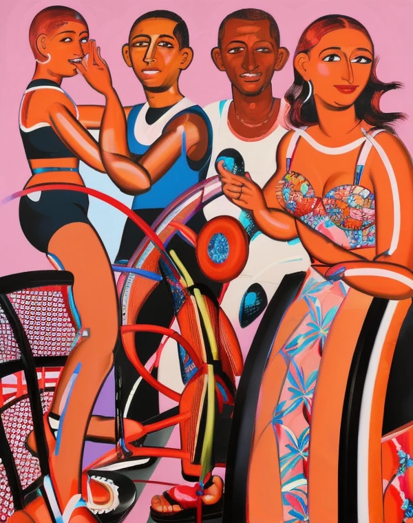 Photograph of an oil and acrylic painting, with evident brushstroke marks, painting in material relief, in pop-art style of human figures engaged in everyday things such as drinking, making telephone calls or dancing or any other action,