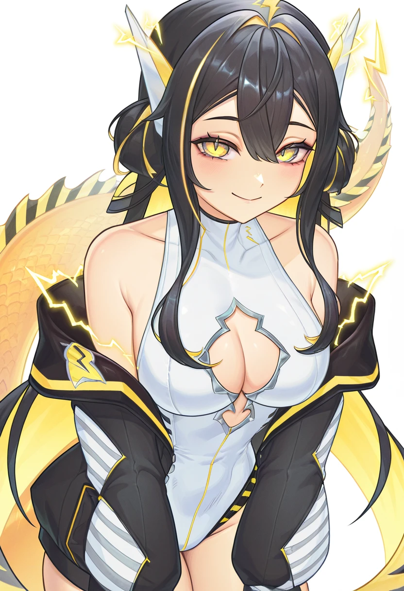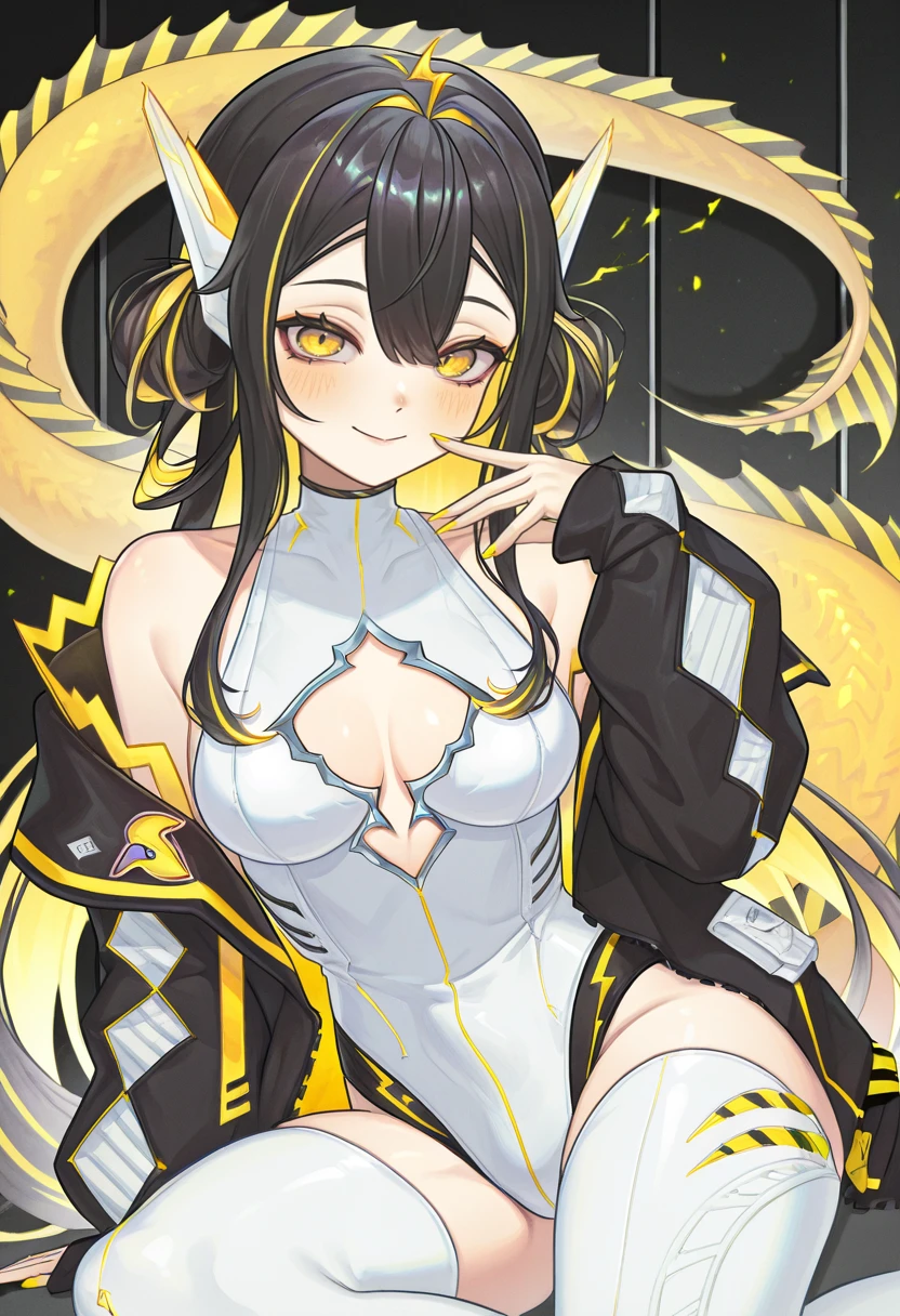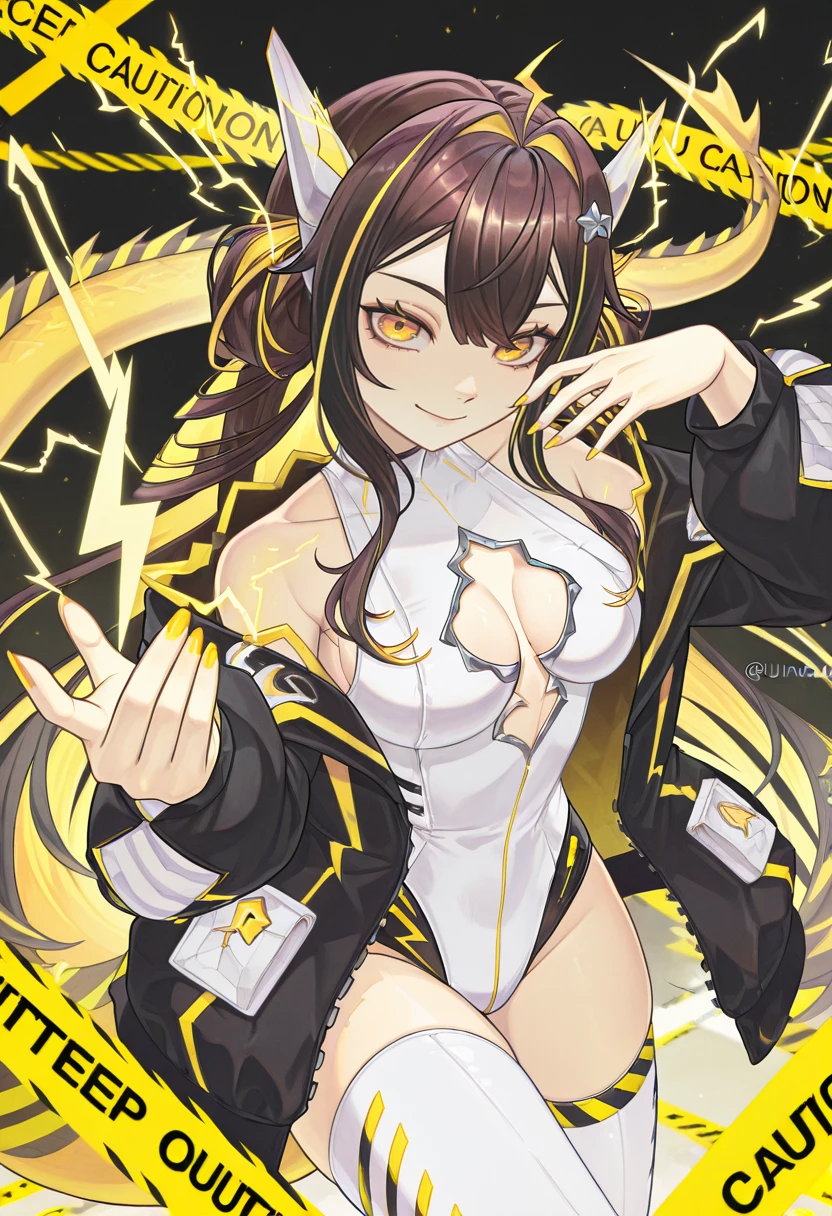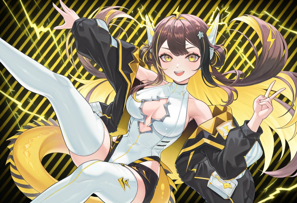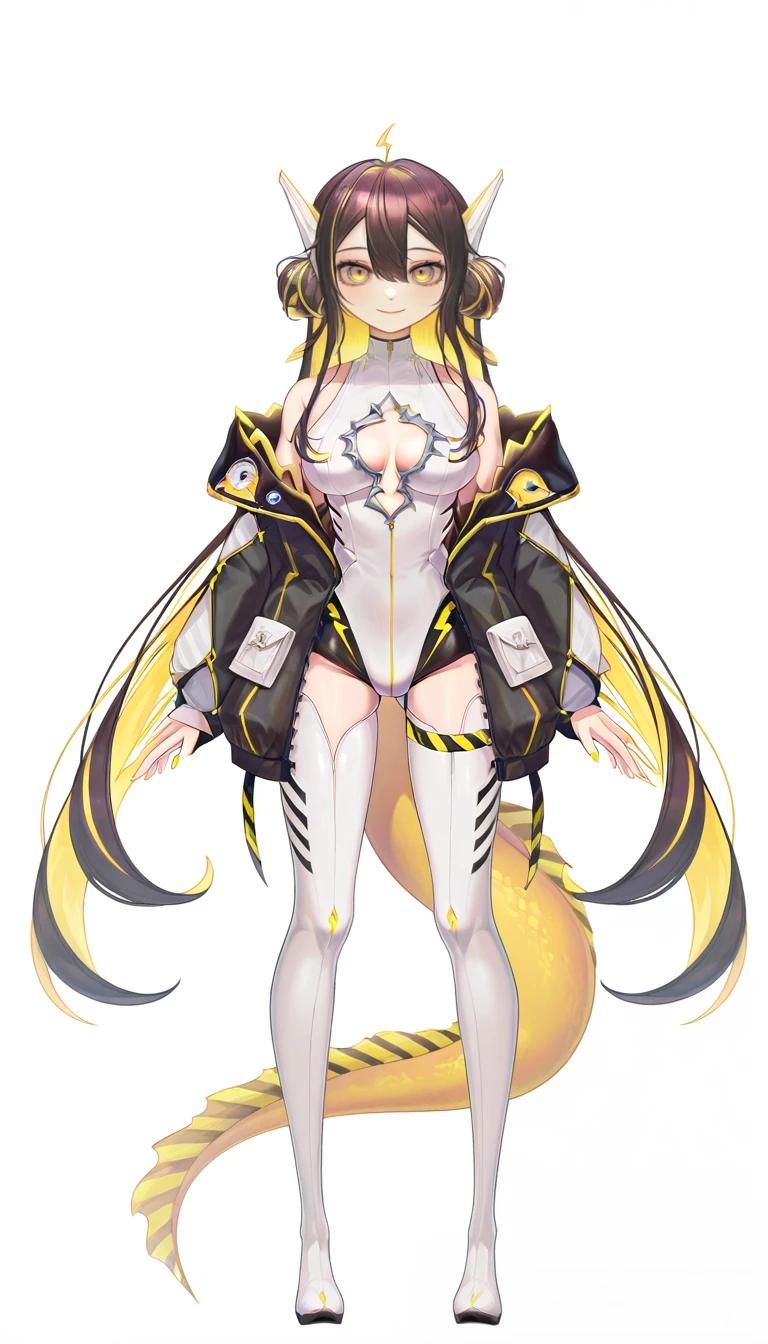JunaOld, 1girl, yellow eyes, slit pupils, blonde hair, brown hair, multicolored hair, two-tone hair, streaked hair, colored inner hair, very long hair, long hair, hair between eyes, breasts, large breasts, cleavage, jacket, black jacket, open jacket, long sleeves, open clothes, zipper, leotard, white leotard, highleg leotard, cleavage cutout, clothing cutout, thighhighs, white thighhighs, thigh boots, thigh strap, white footwear, star hair ornament, hair ornament, ahoge, hair bun, double bun, twintails, yellow nails, nail polish, tail, dragon tail, fins, bare shoulders