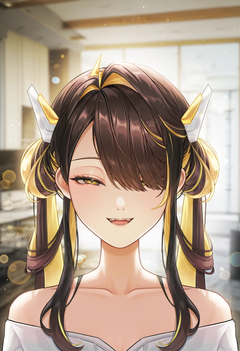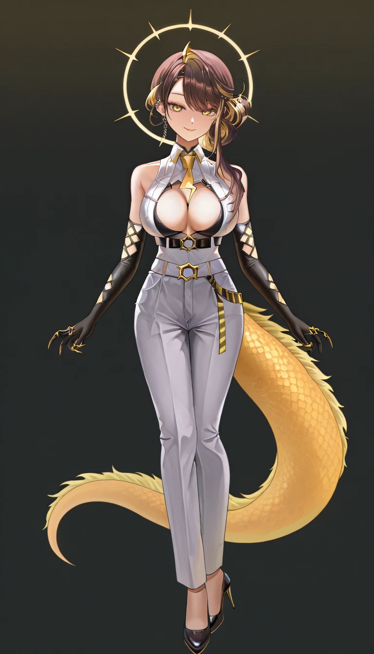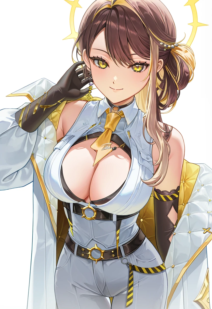JunaNew, 1girl, yellow eyes, slit pupils, brown hair, blonde hair, multicolored hair, streaked hair, long hair, hair intakes, hair ornament, halo, yellow halo, breasts, large breasts, cleavage, mole, thigh gap, jewelry, cleavage cutout, clothing cutout, pants, white pants, shirt, white shirt, sleeveless, jacket, white jacket, coat, center opening, bare shoulders, gloves, black gloves, elbow gloves, belt, white belt, necktie, yellow necktie, choker, earrings, single earring, claw ring, high heels