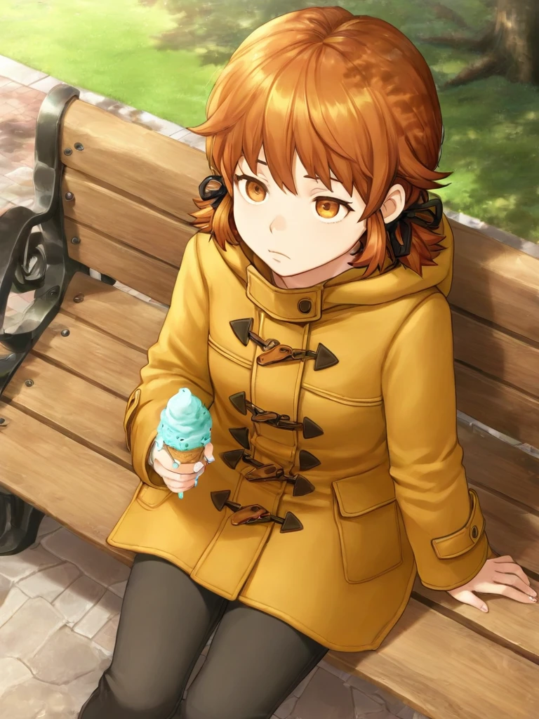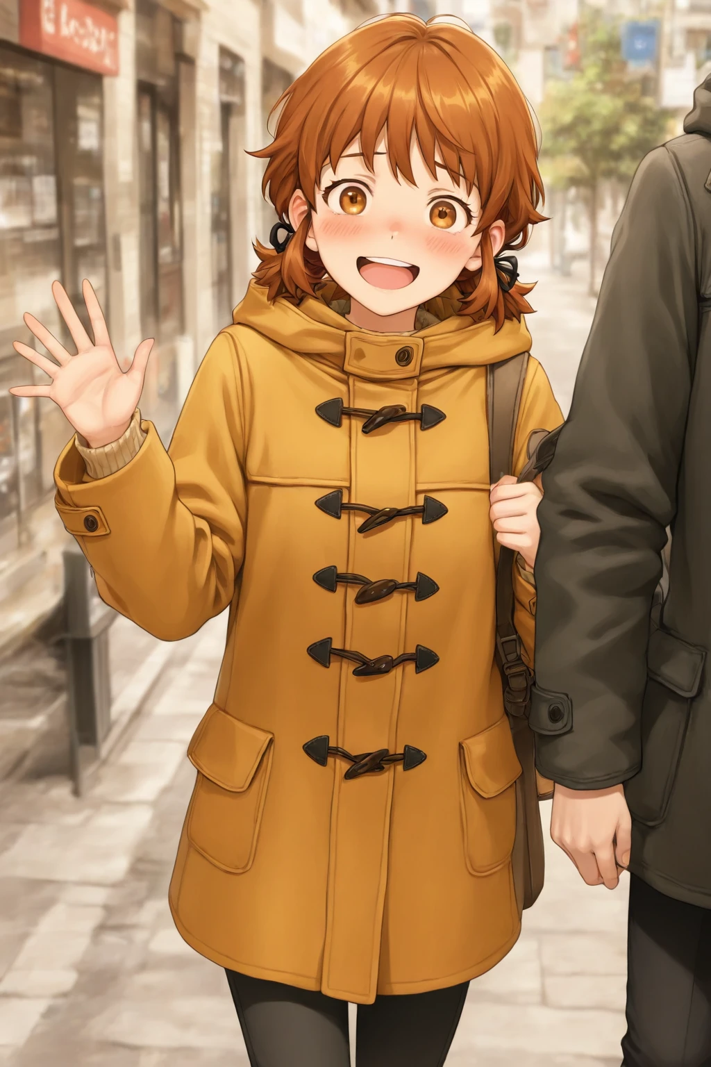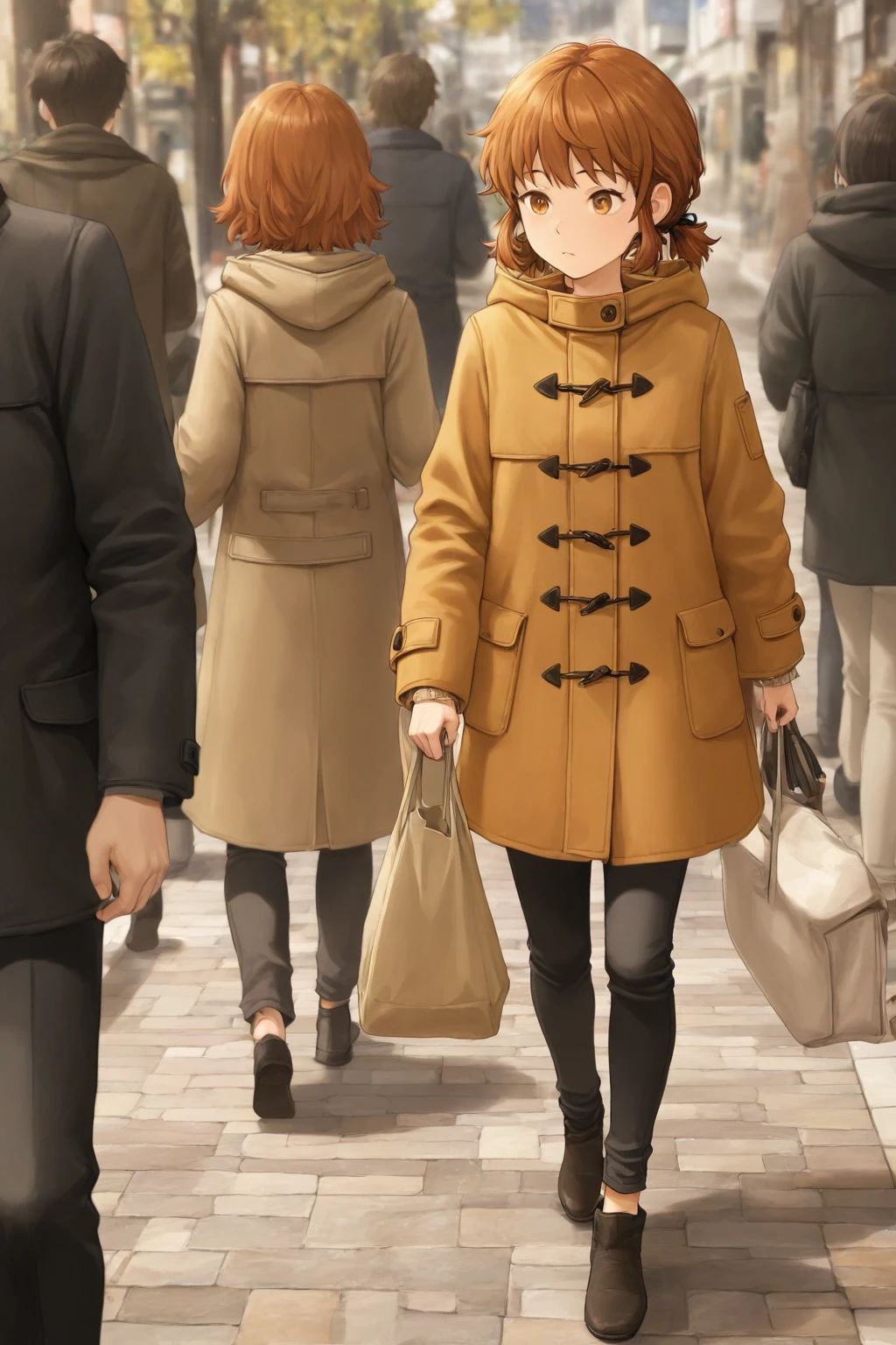 Anne_Macy, 1girl, brown hair, short hair, brown eyes, coat, pants, black pants, hood, bangs, long sleeves