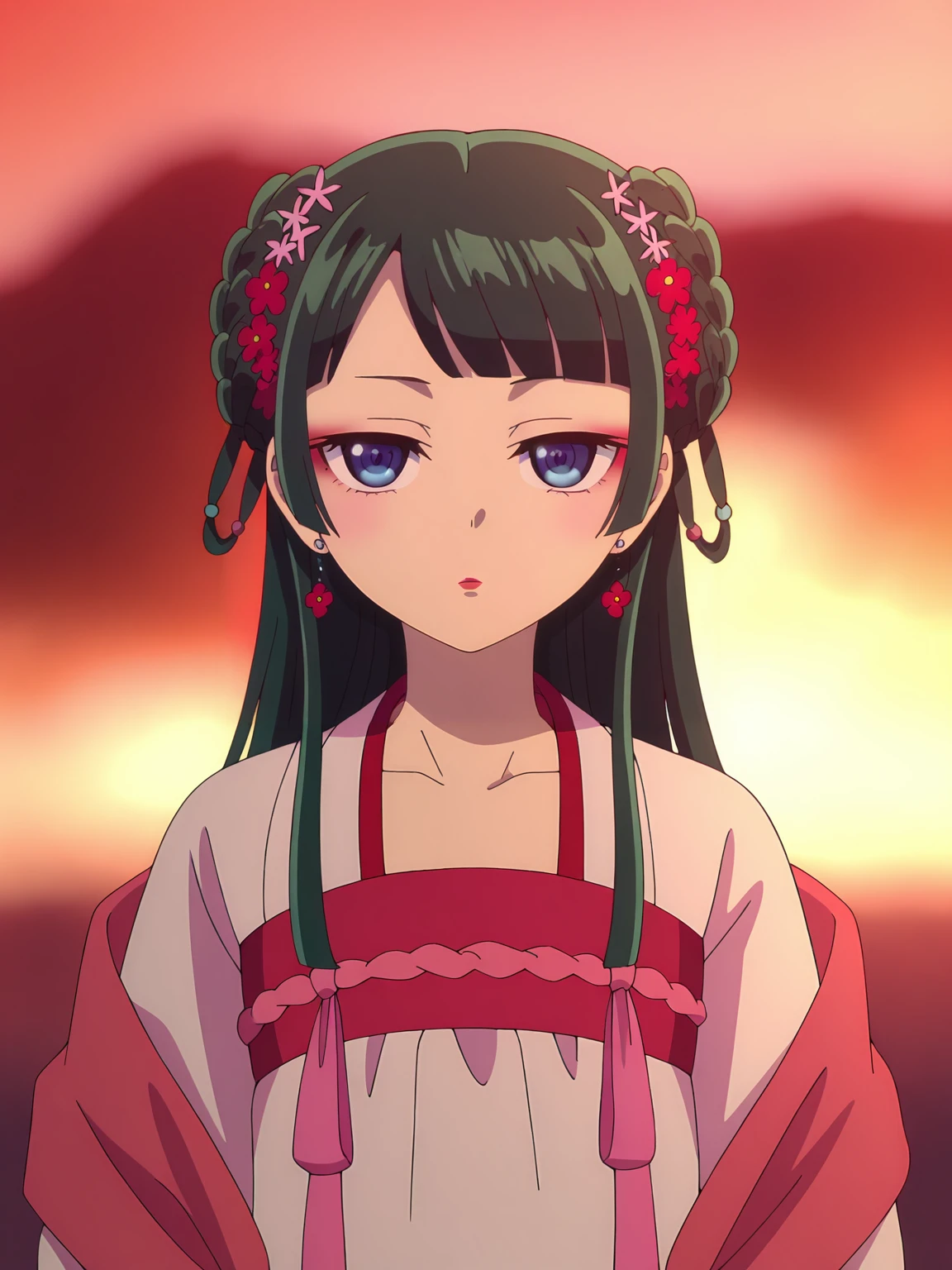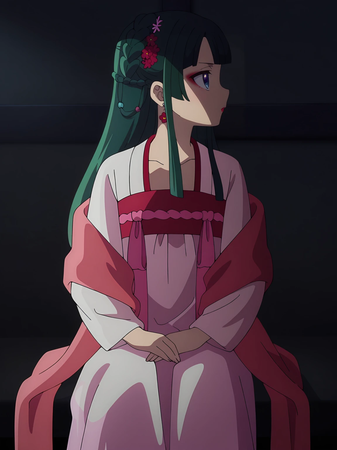 maomao (kusuriya no hitorigoto), 1girl, solo, blue eyes, dark green hair, long hair, twin braids, hime cut, hair beads, hair flower, flower earrings, red lips, red eyeshadow, makeup, pink hanfu, red shawl, pink ribbon
