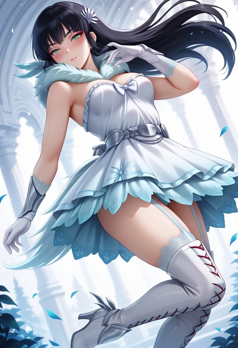 long hair, black hair, green eyes, hair ornament, long white gloves, white dress, white thigh boots, garter straps, high heels, white boa