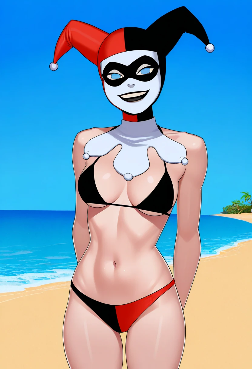 1girl, harleyquinn, domino mask, jester cap, black and red bodysuit, blue eyes, no pupils, white sclera