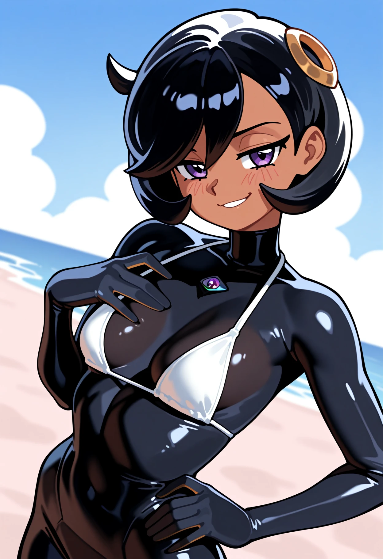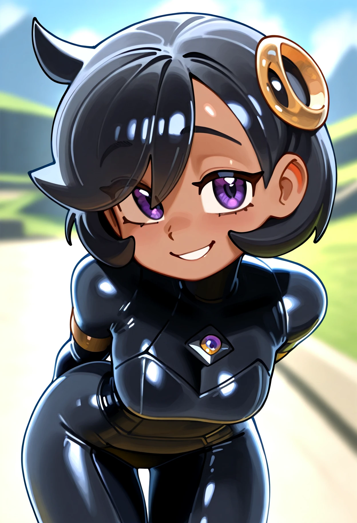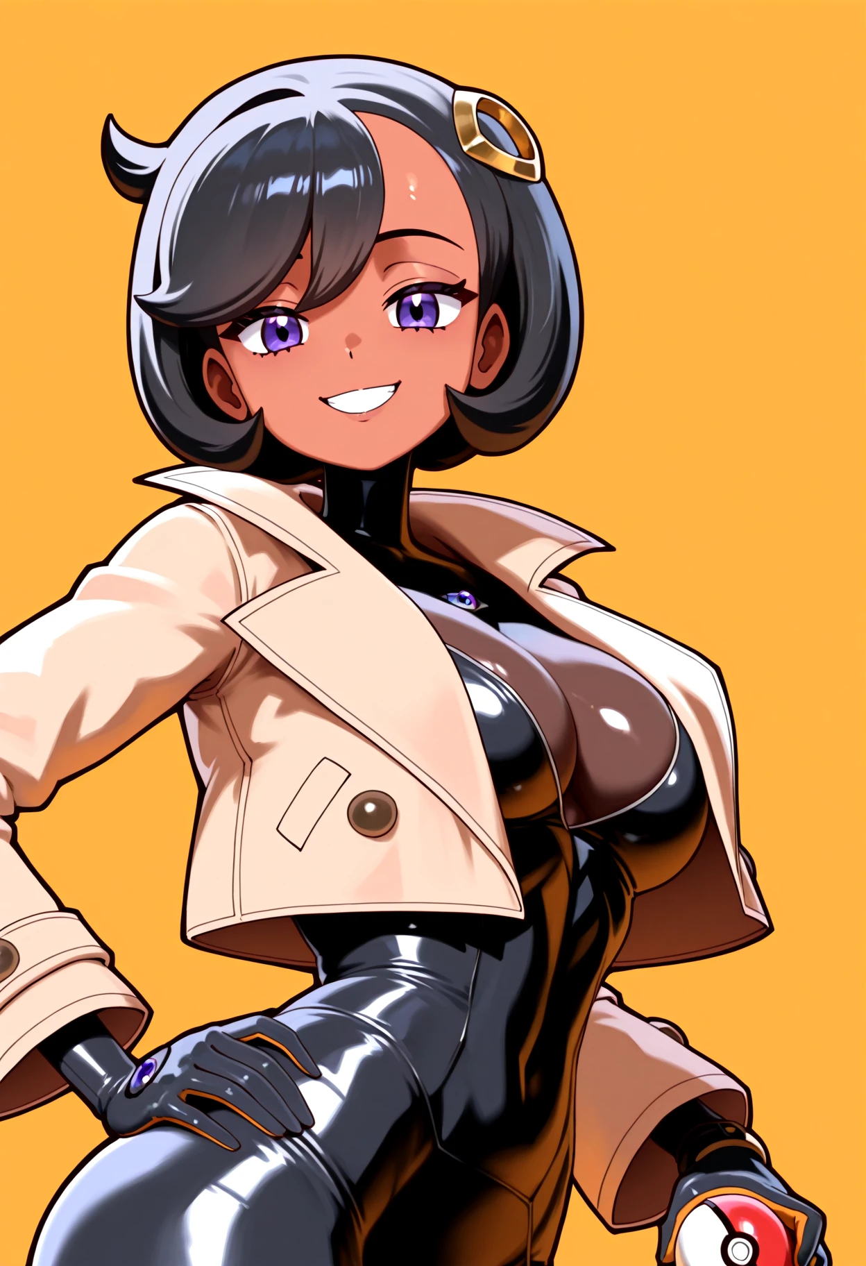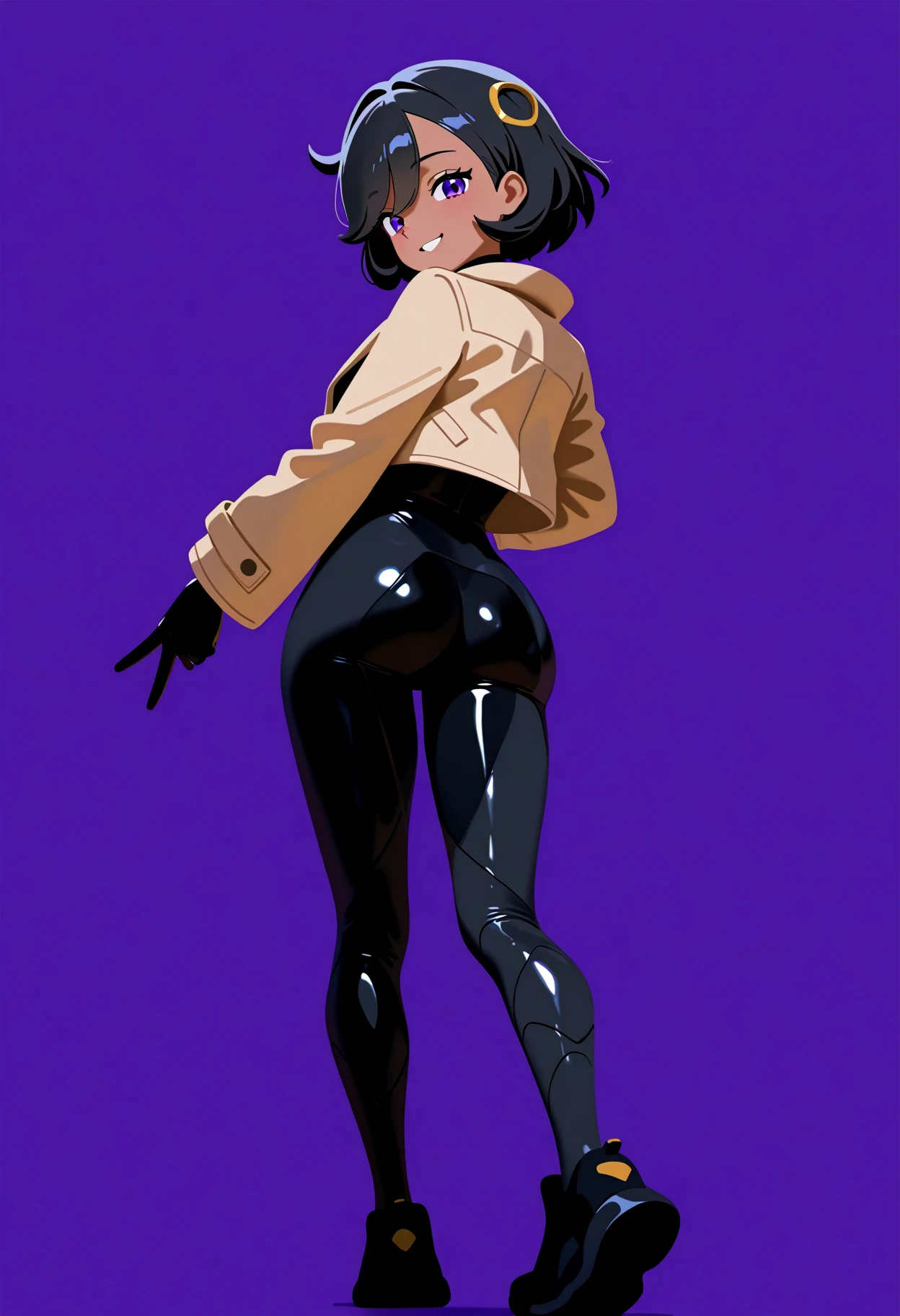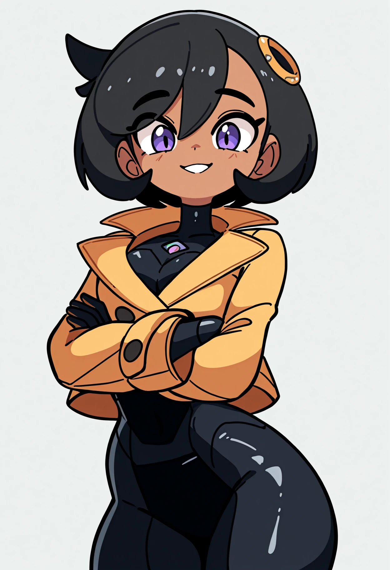 emmaza, black hair, short hair, dark skin, dark-skinned female, bangs, purple eyes, hair ornament, jacket, black bodysuit,