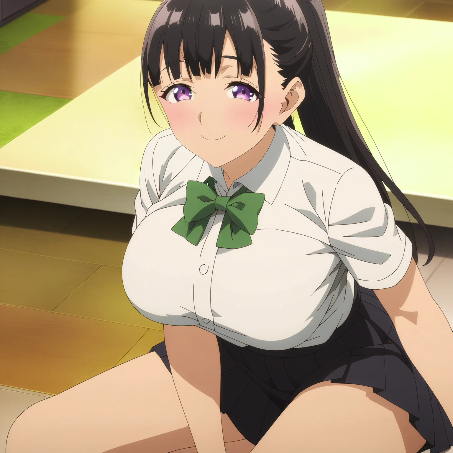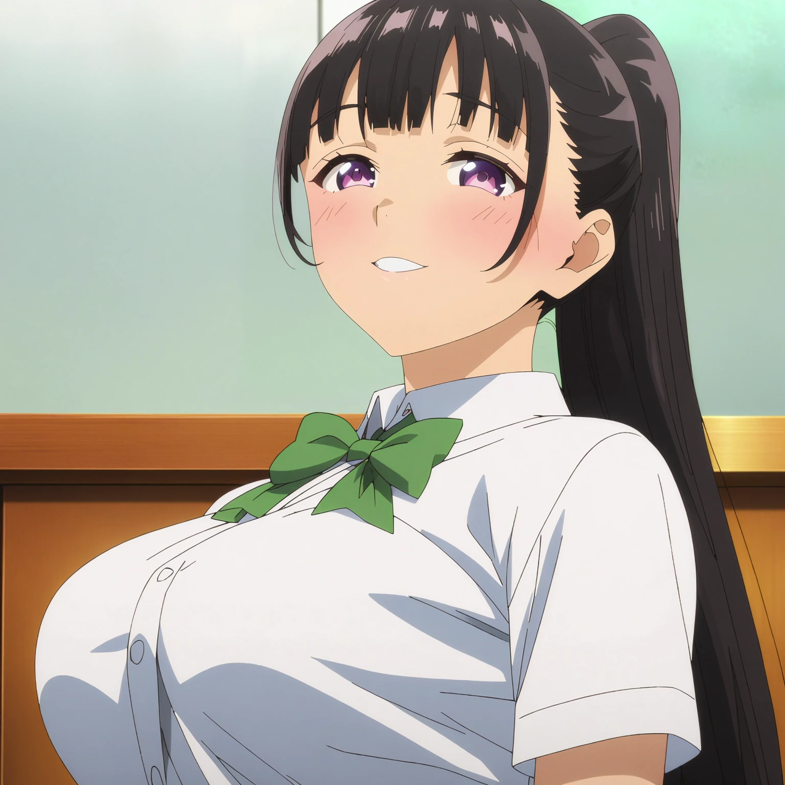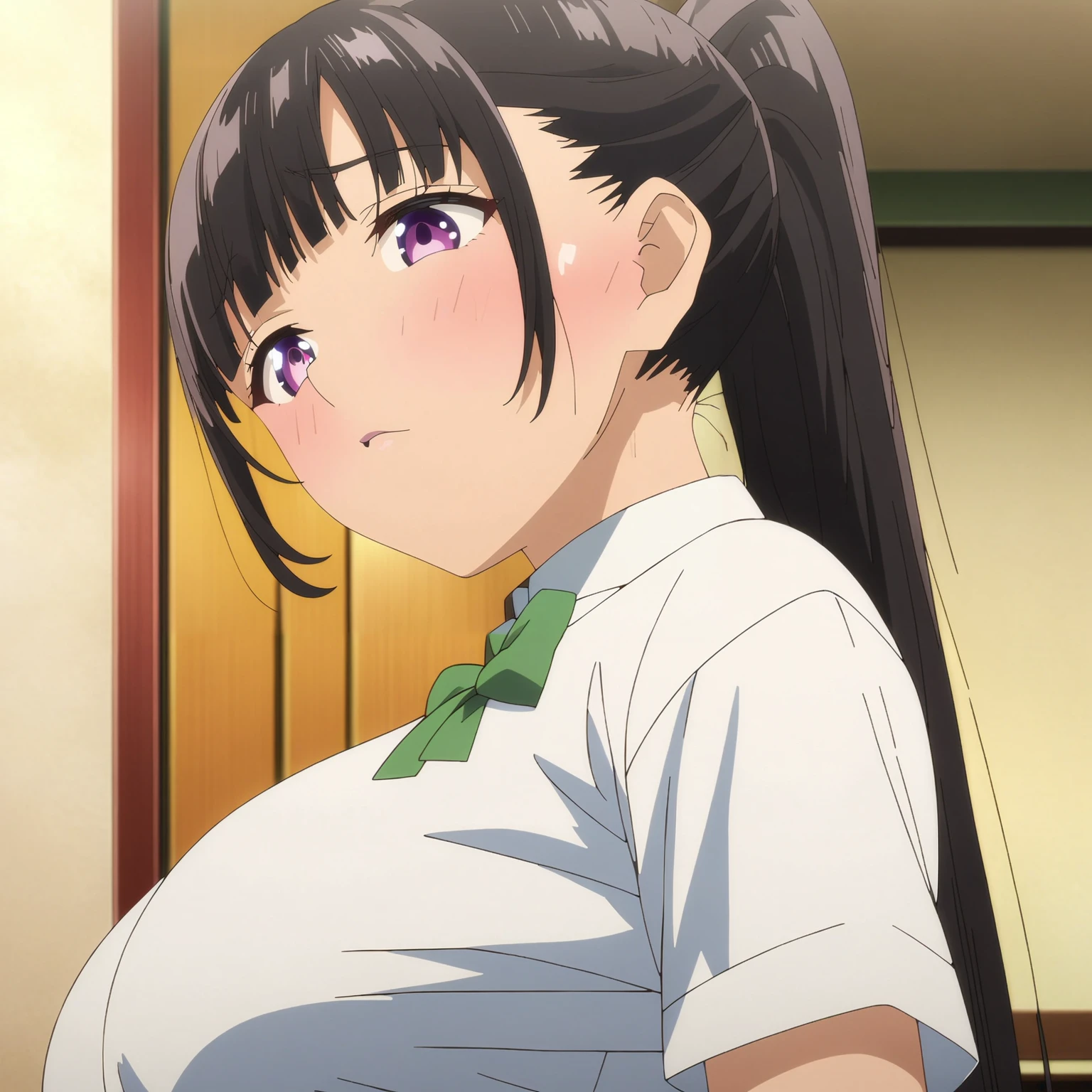YuiTachibana,1girl,black hair,ponytail,purple eyes,large breasts,