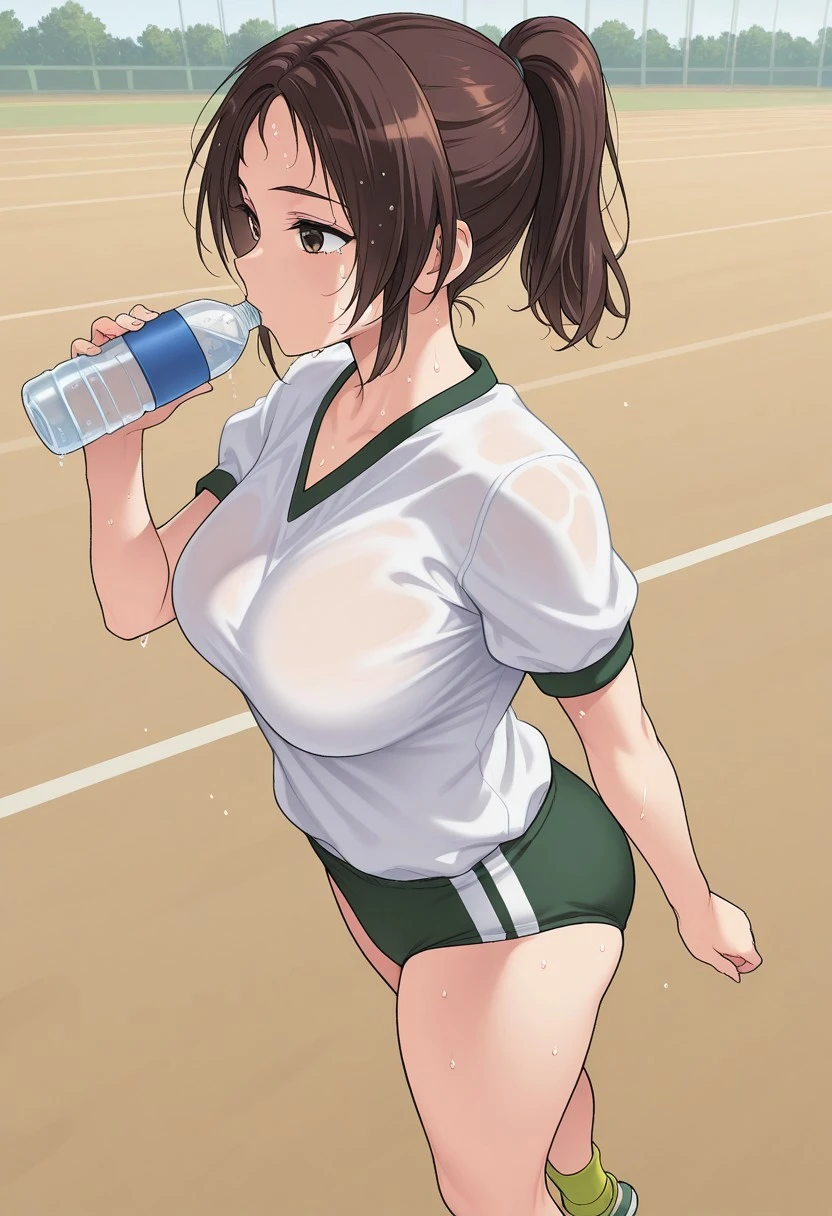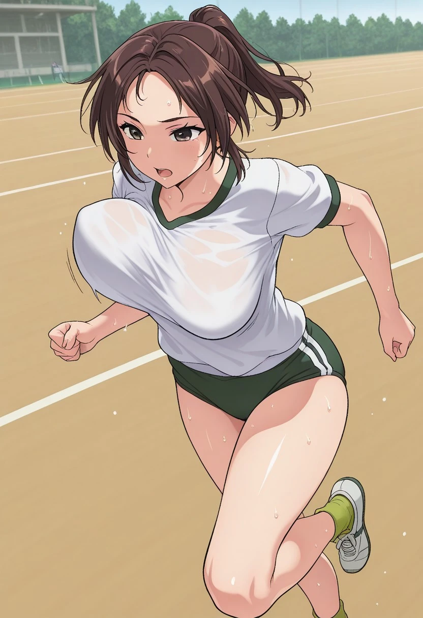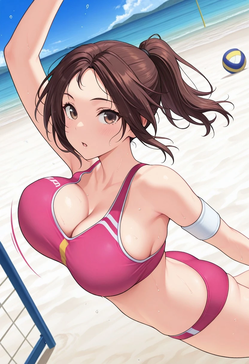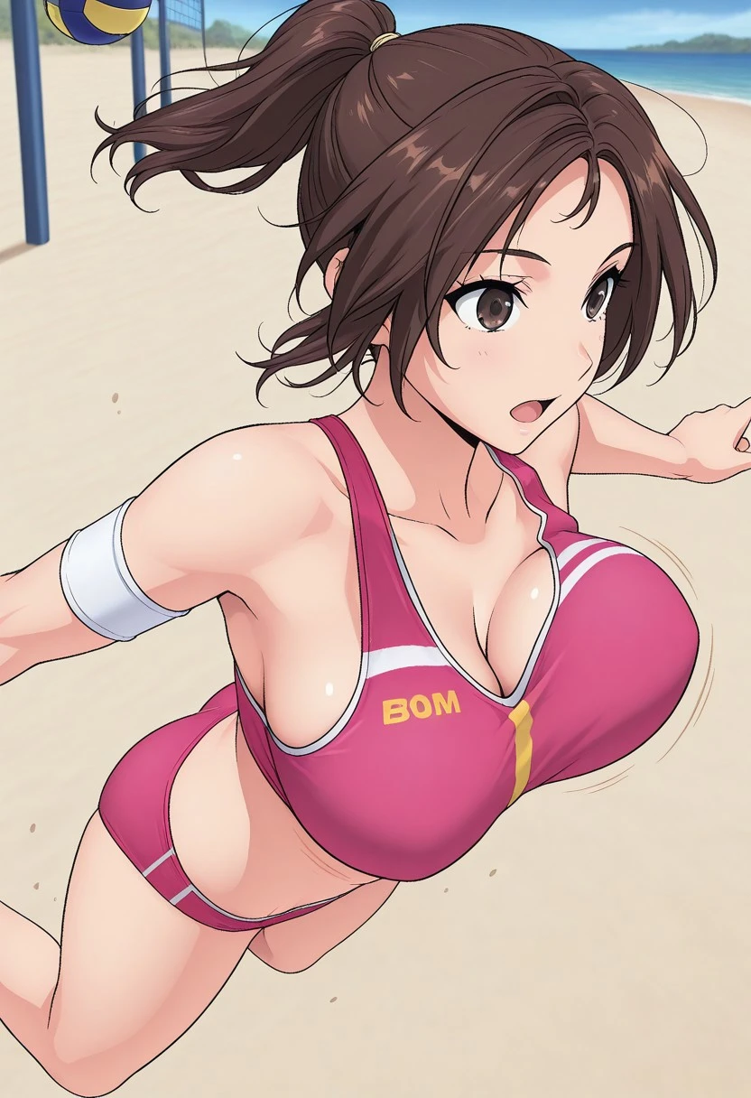 brown hair, medium hair, ponytail, parted hair, brown eyes, large breasts
