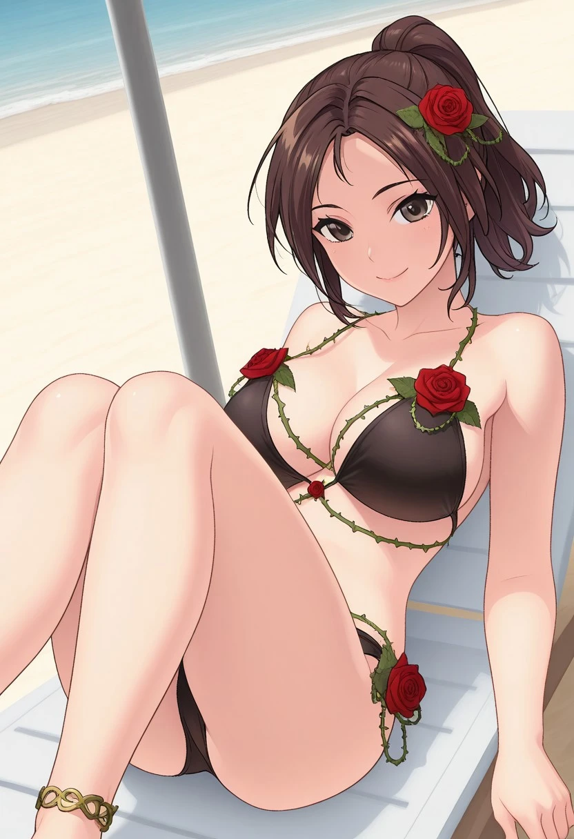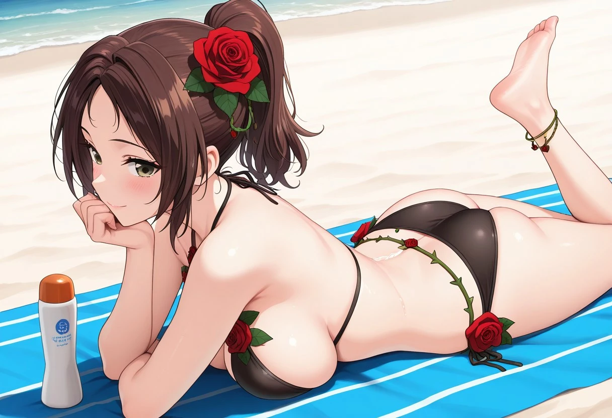 rose bikini, black bikini, cleavage, rose decorations, anklet, hair flower,