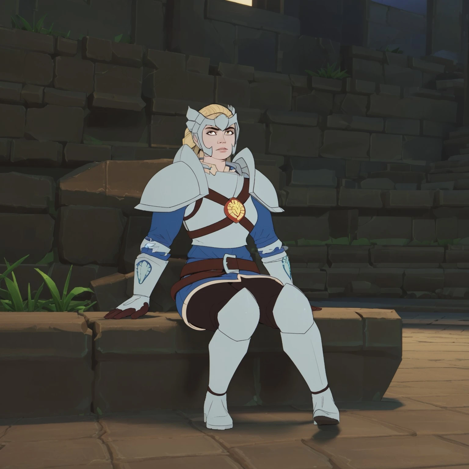 1girl,solo,helmet,blonde hair,single braid,armor,shoulder armor,gloves,belt,boots