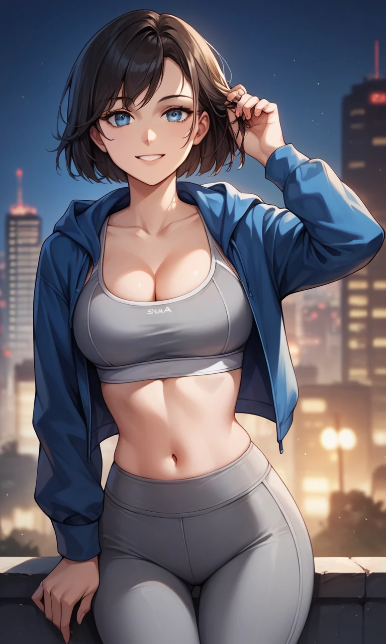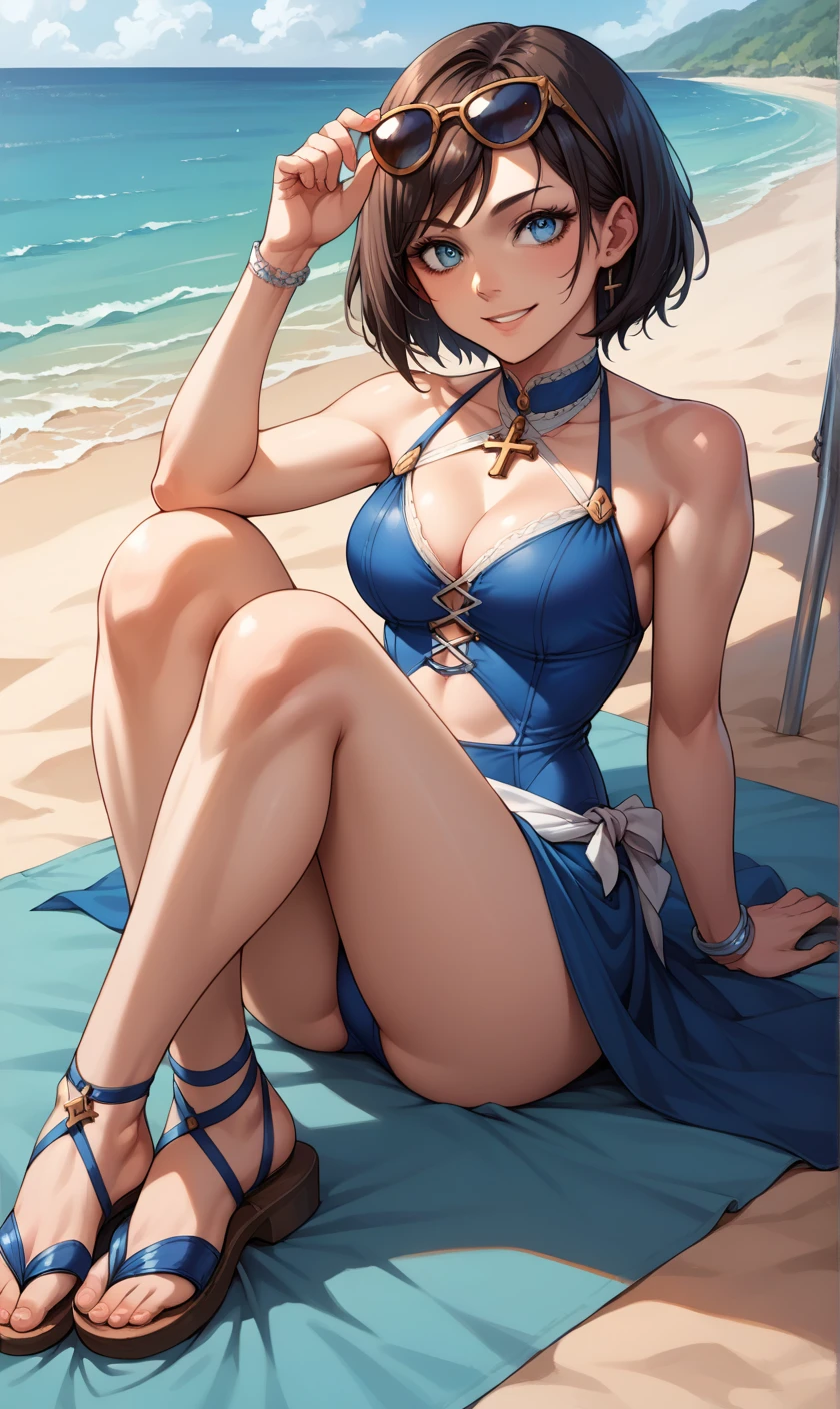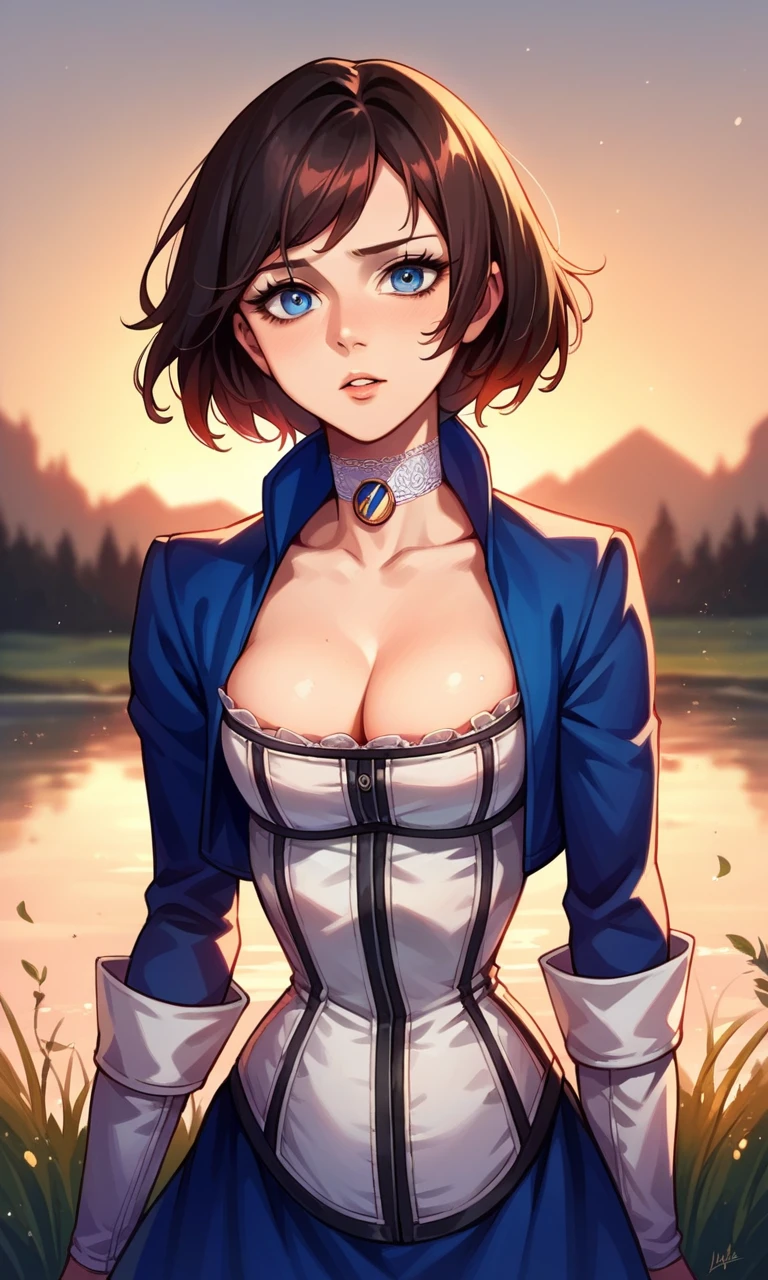 "ELIZABETH1, Short hair, blue eyes, cropped jacket, blue dress, corset, choker, cleavage" for her first outfit