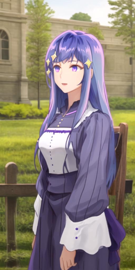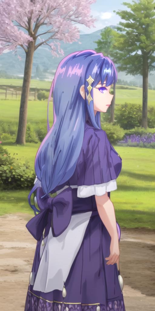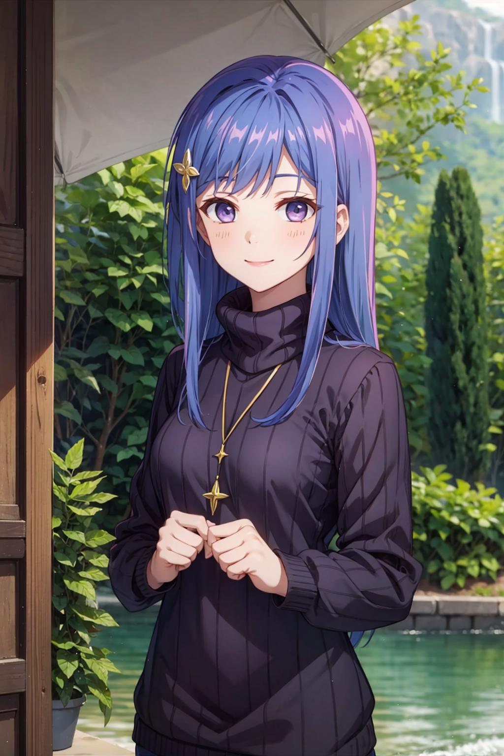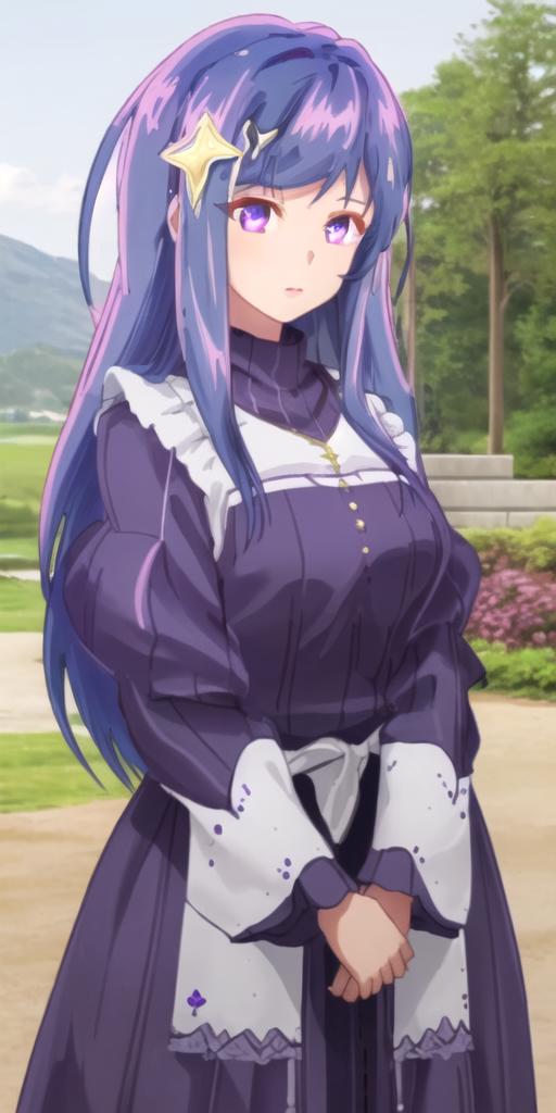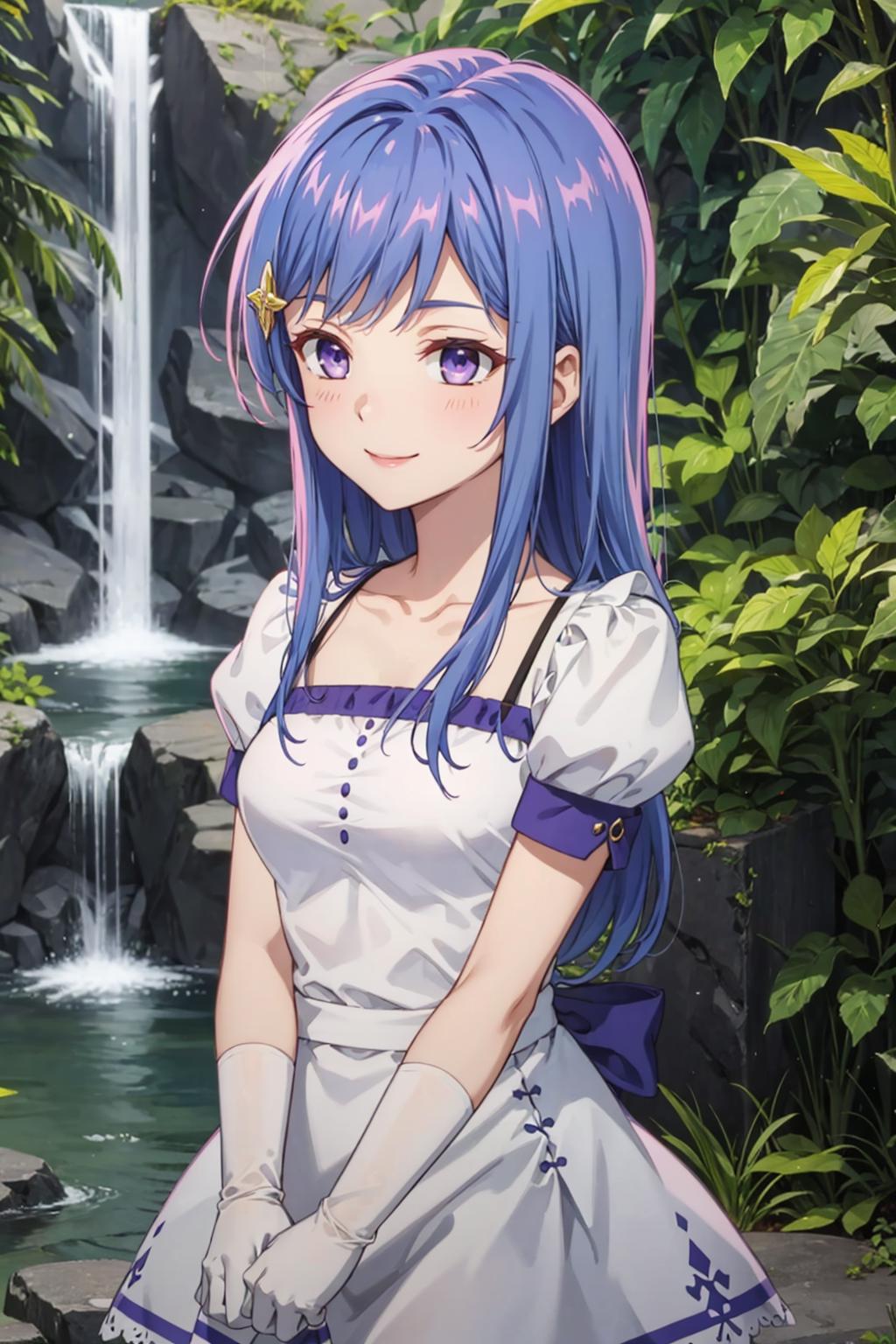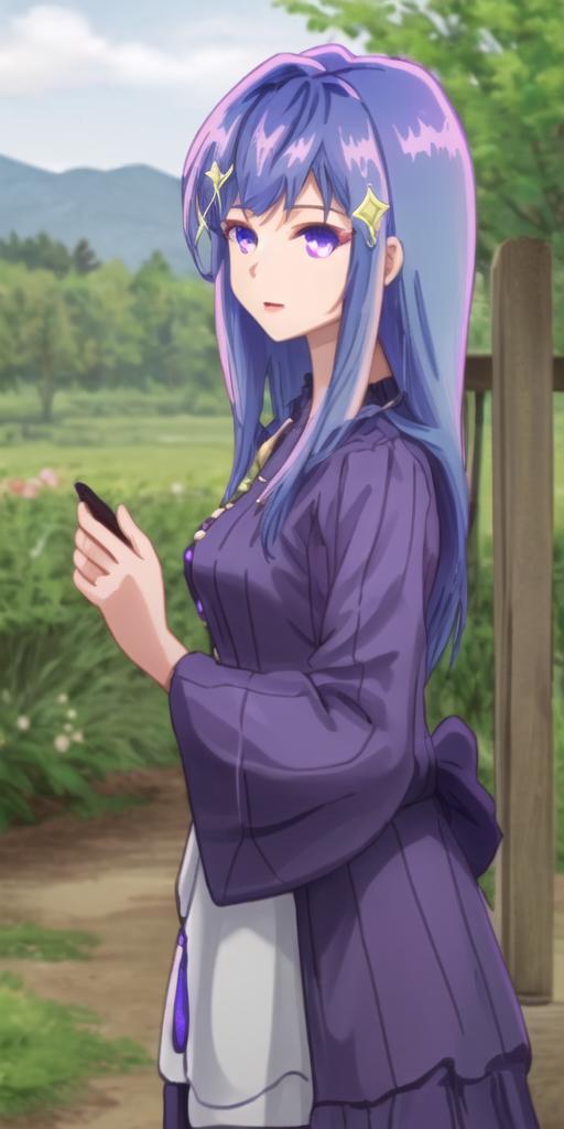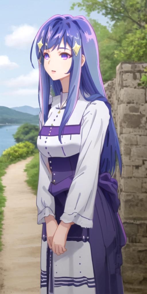 maha, blue hair, long hair, purple eyes, hair ornament,