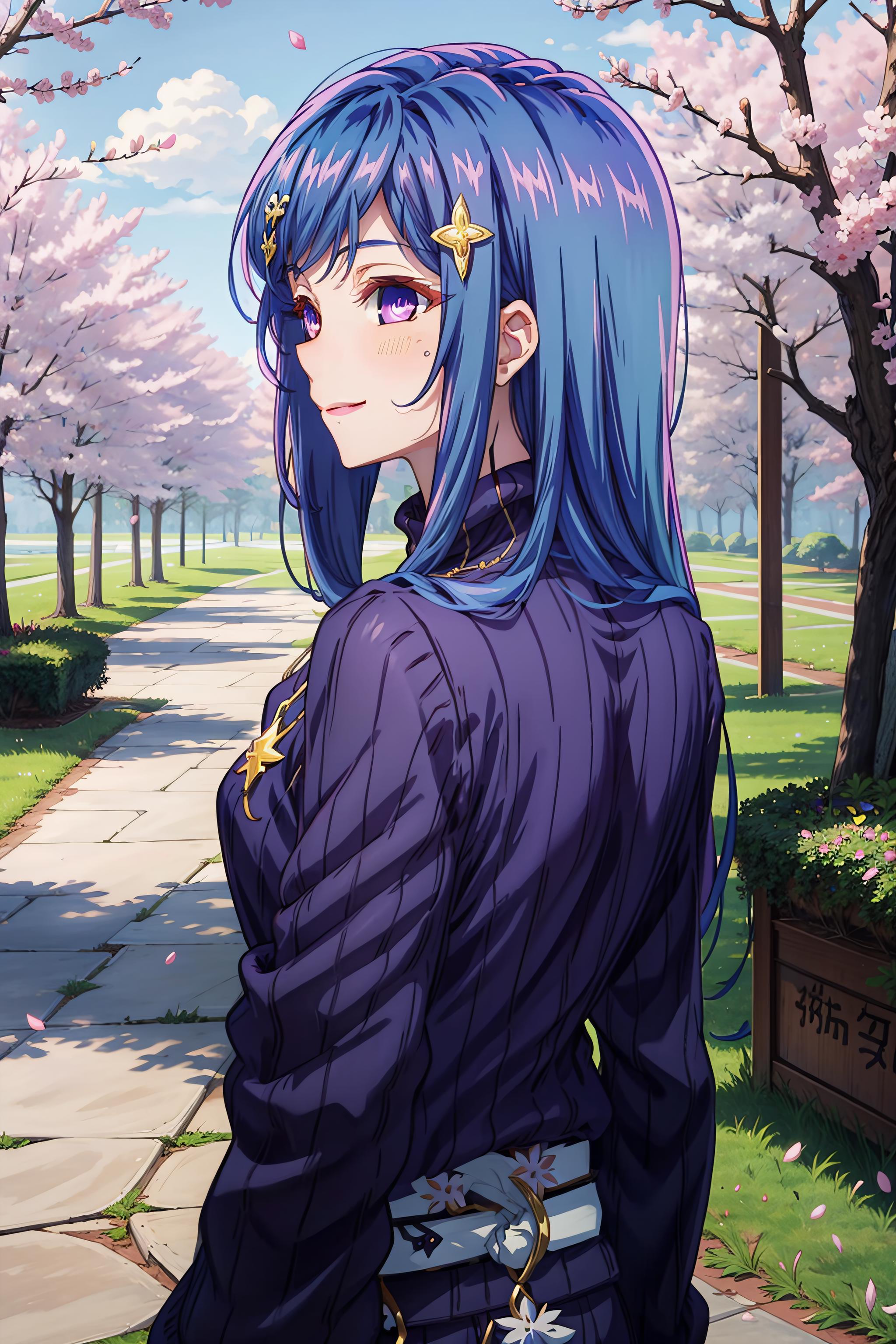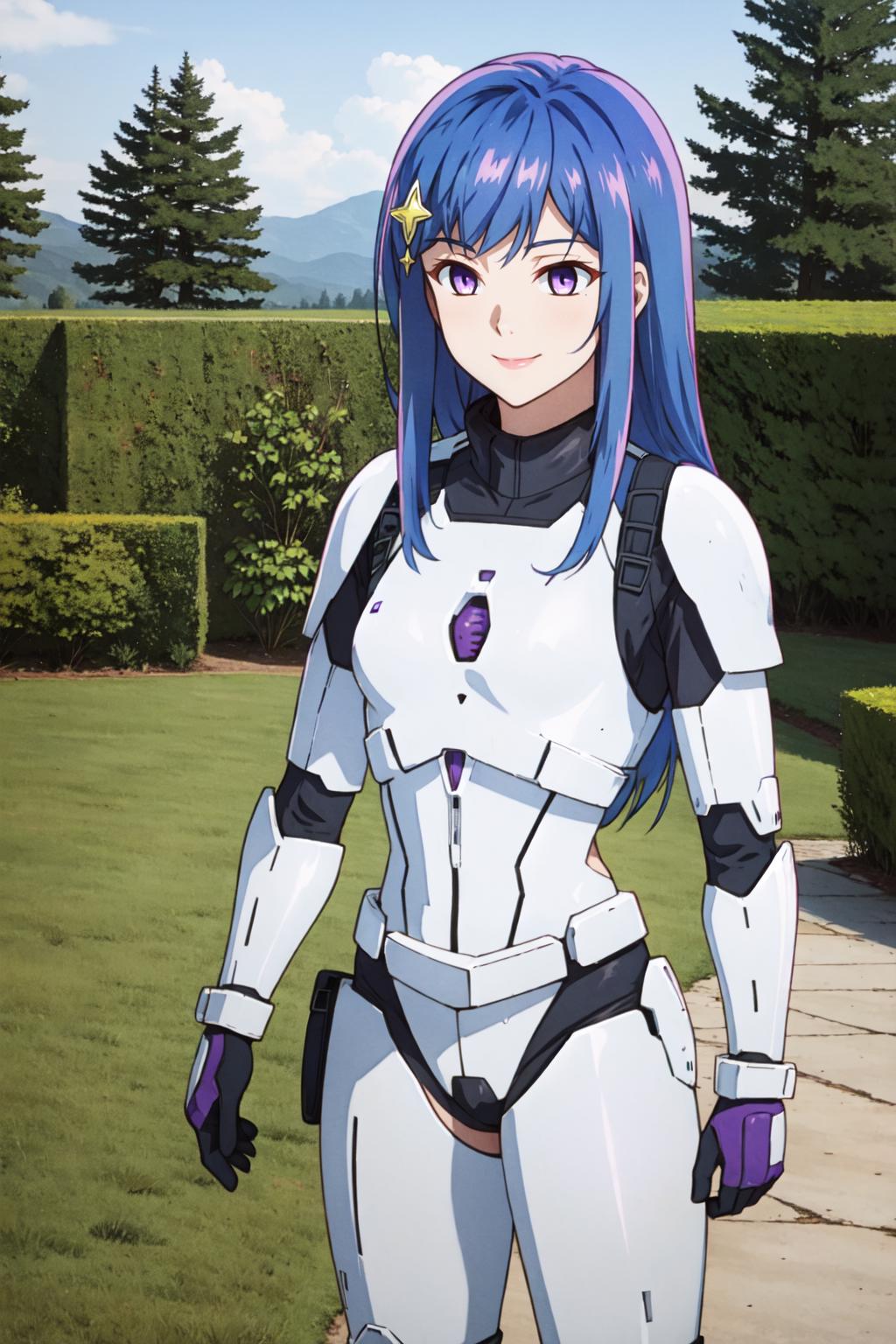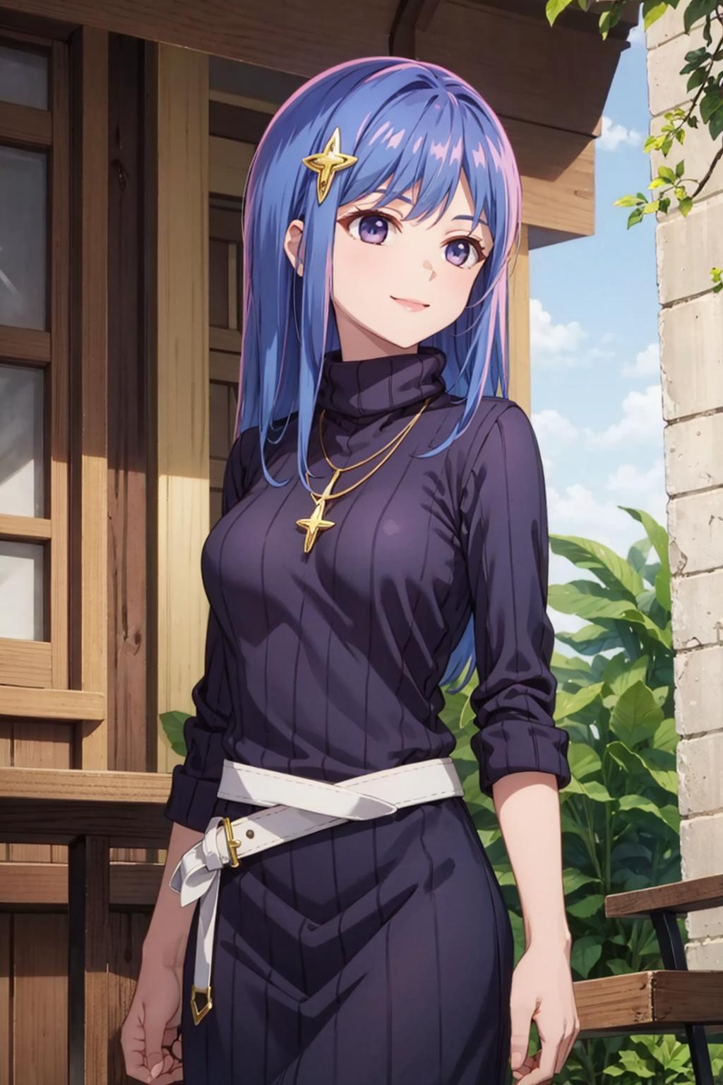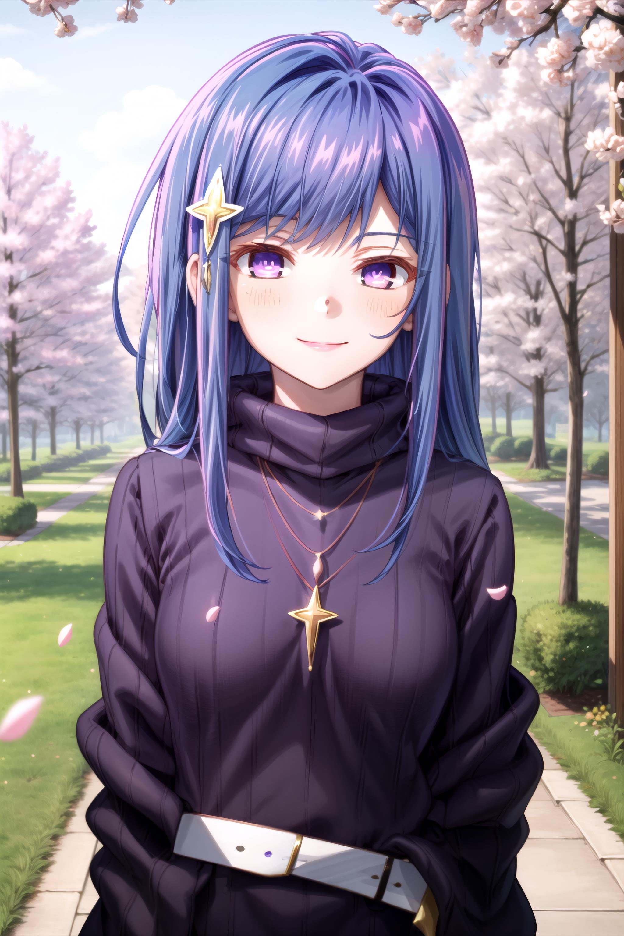 maha, blue hair, long hair, purple eyes, hair ornament,