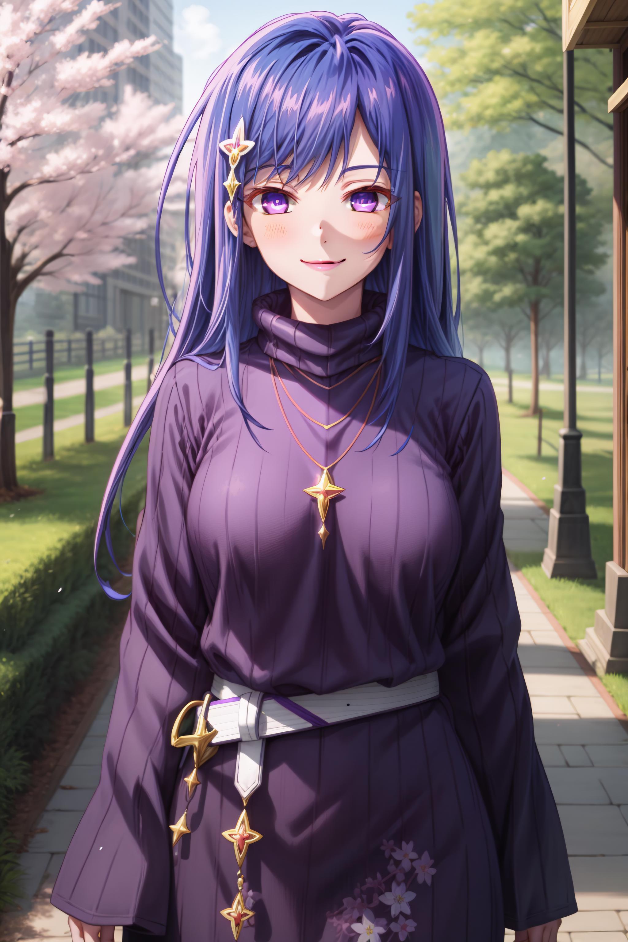 turtleneck sweater, purple sweater, white belt, necklace,