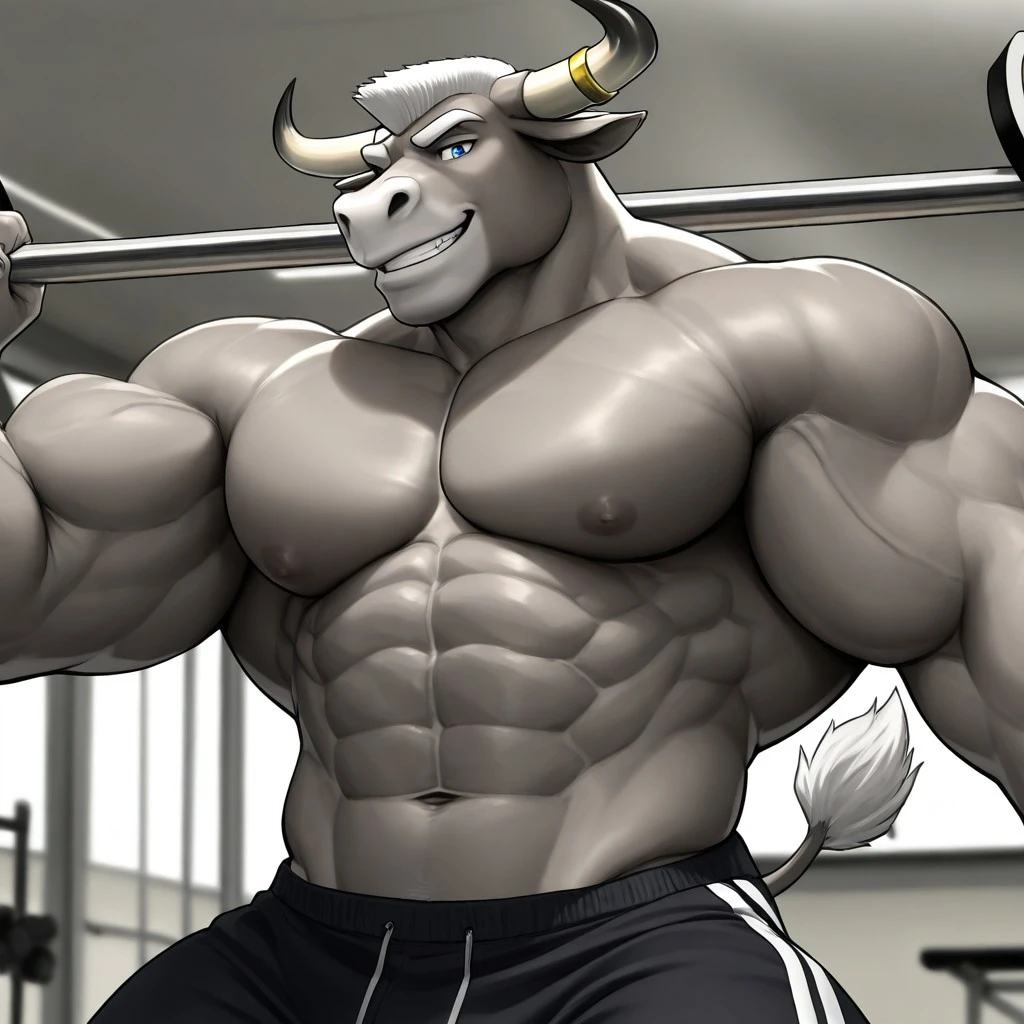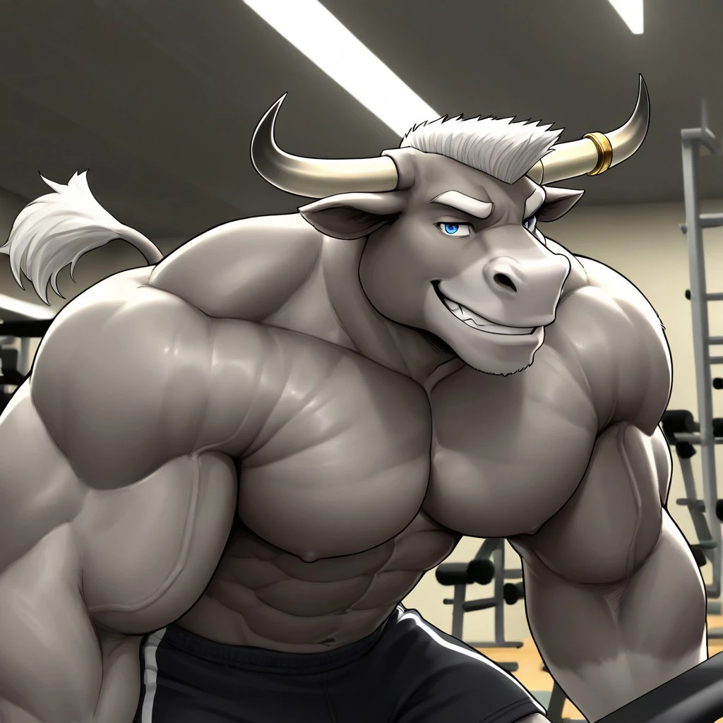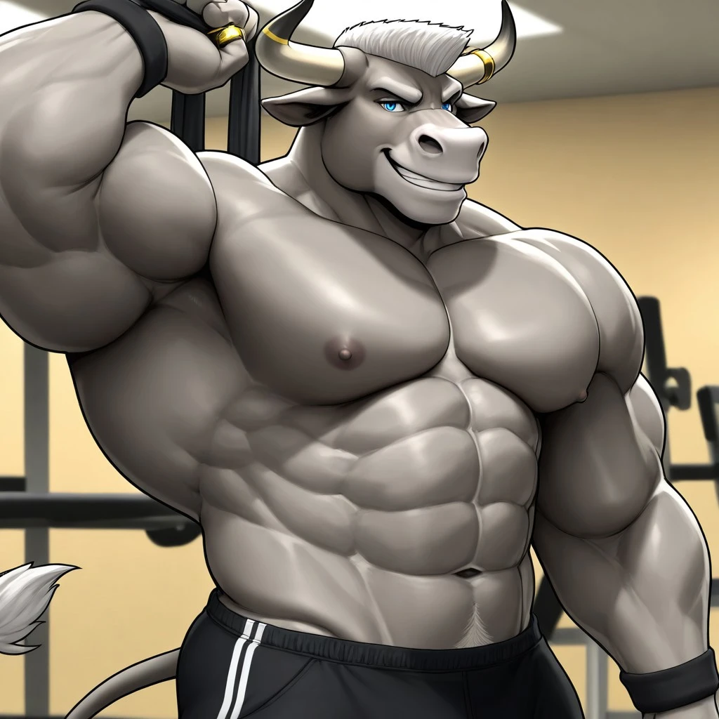 Key words: Gus, furry, bull, tail, grey body, white crew cut hair, blue eyes, muscular, bara.