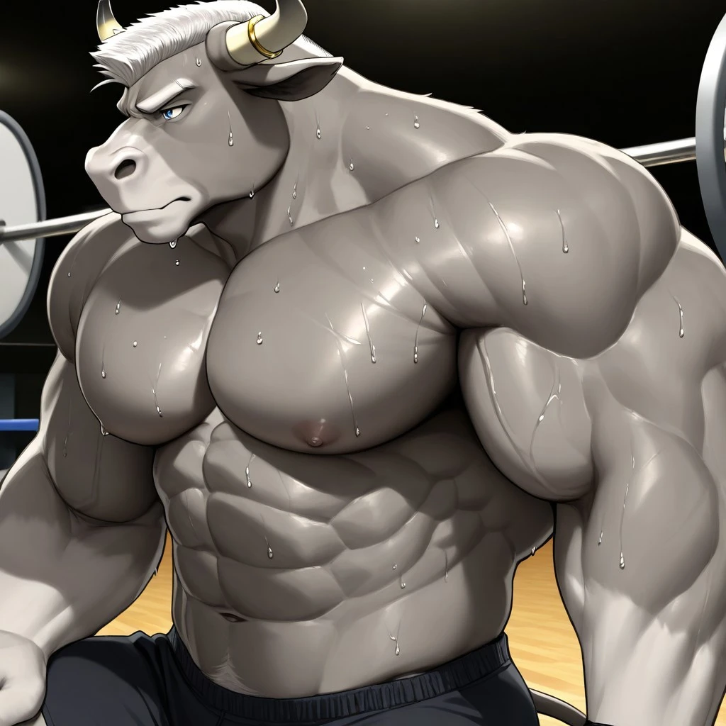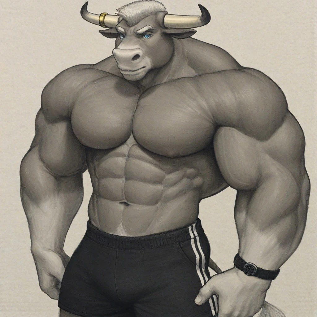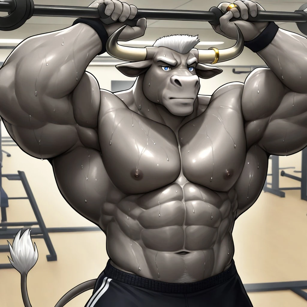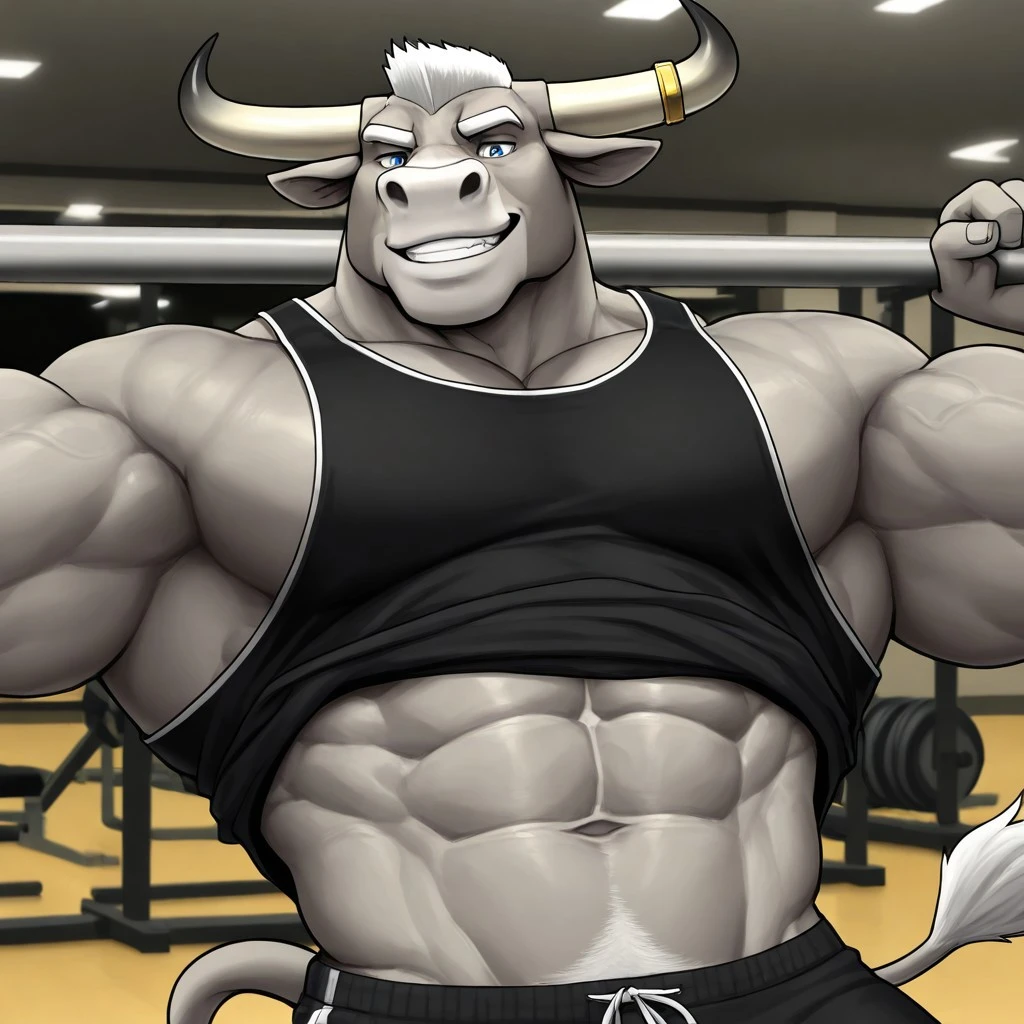 Key words: Gus, furry, bull, tail, grey body, white crew cut hair, blue eyes, muscular, bara.