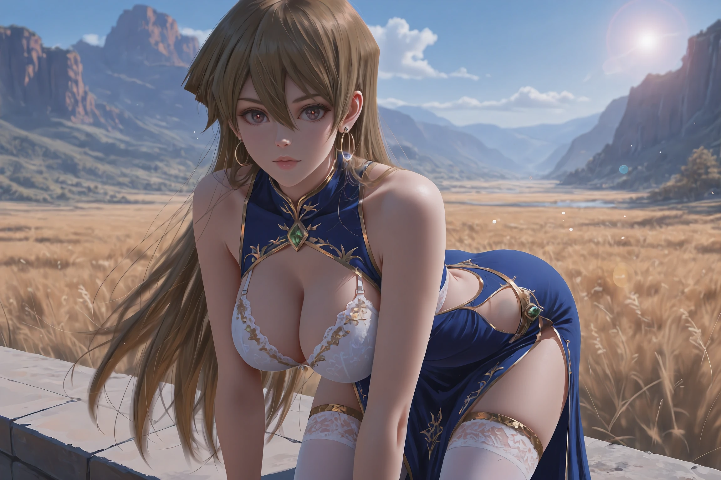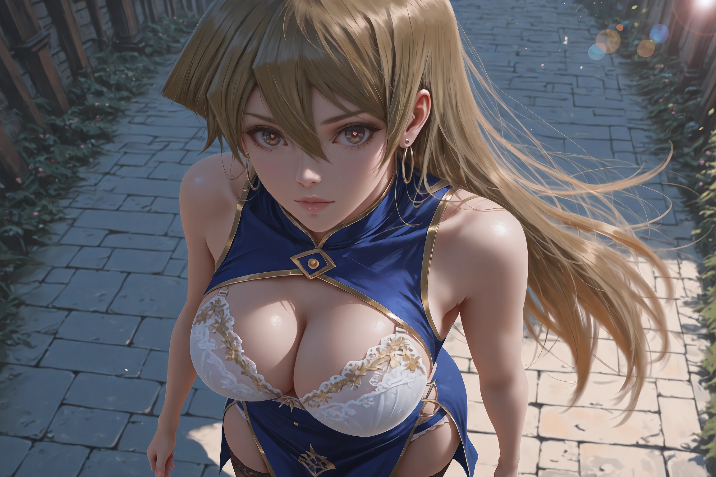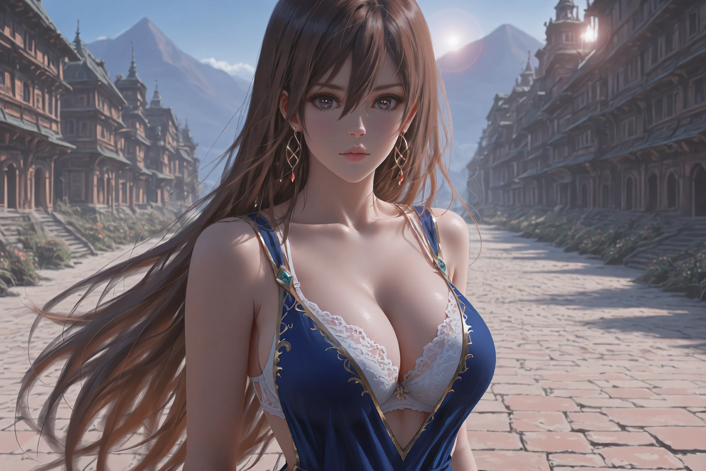 (2ND CLOTHING):Alexis Rhodes, tenjouin asuka, very long hair,brown eyes,hair between eyes,straight hair,brown hair,earrings,clothing cutout,dress,jewelry,gold trim,blue dress,hoop earrings,bra,side cutout,sleeveless dress,white bra,bare arms,arm support,