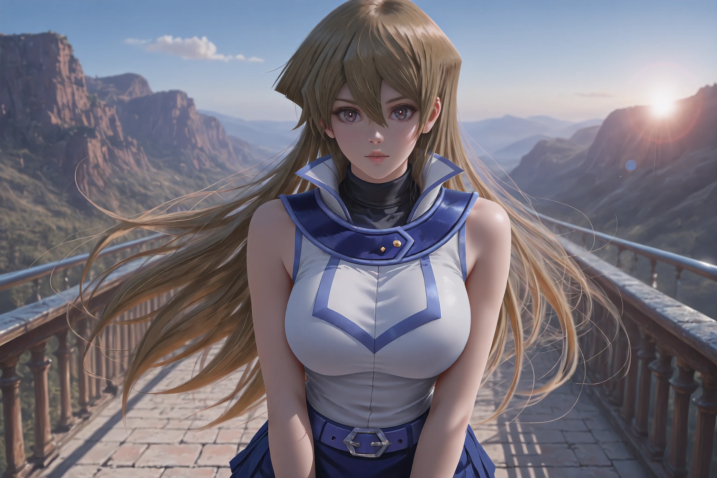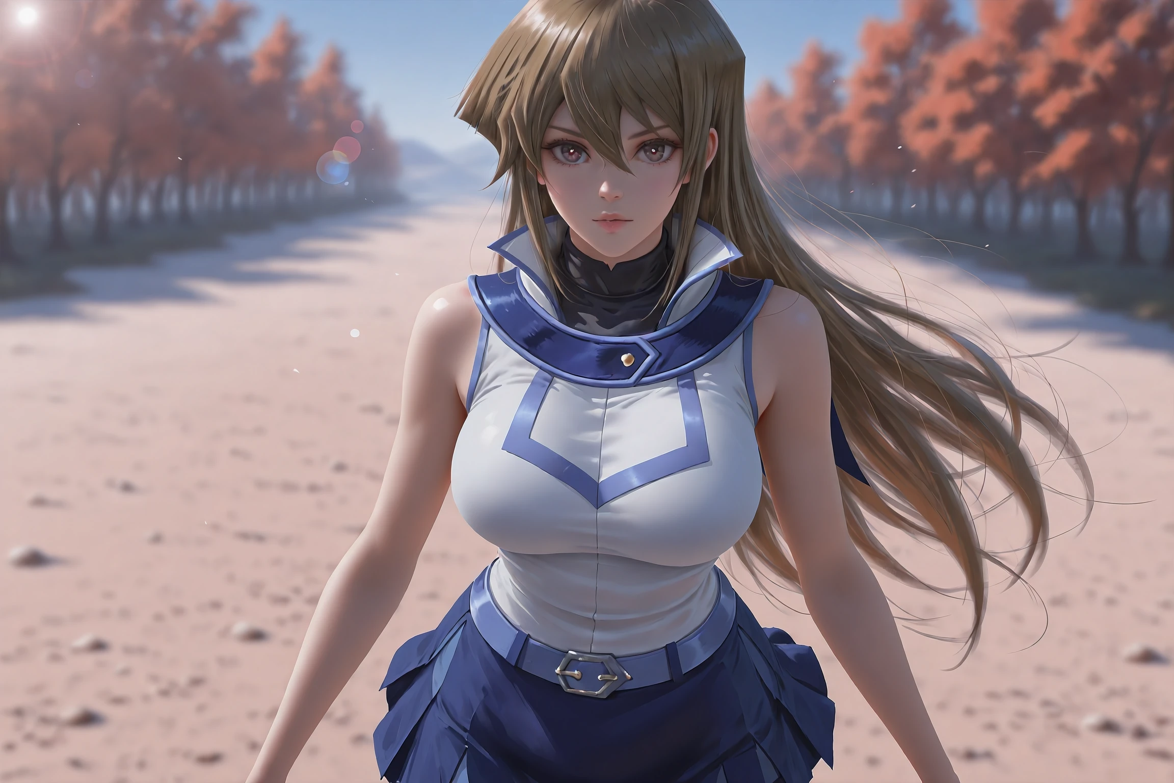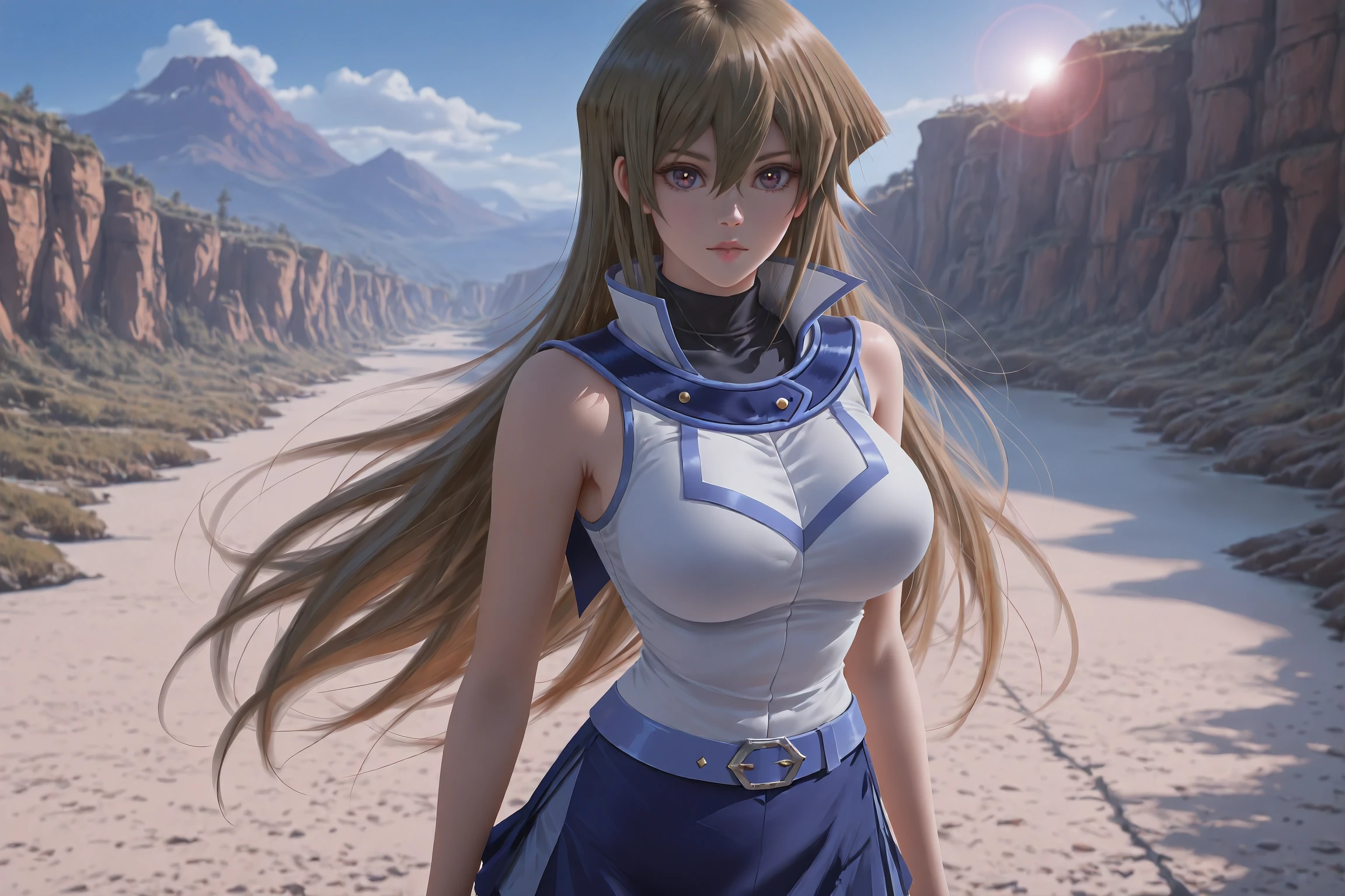 (DEFLUAT):Alexis Rhodes, tenjouin asuka, very long hair,duel academy uniform \(yu-gi-oh! gx\),brown eyes,skirt,sleeveless,blue skirt,hair between eyes,straight hair,school uniform,miniskirt,turtleneck,sleeveless jacket,brown hair,bare arms,jacket,shirt,belt buckle,,