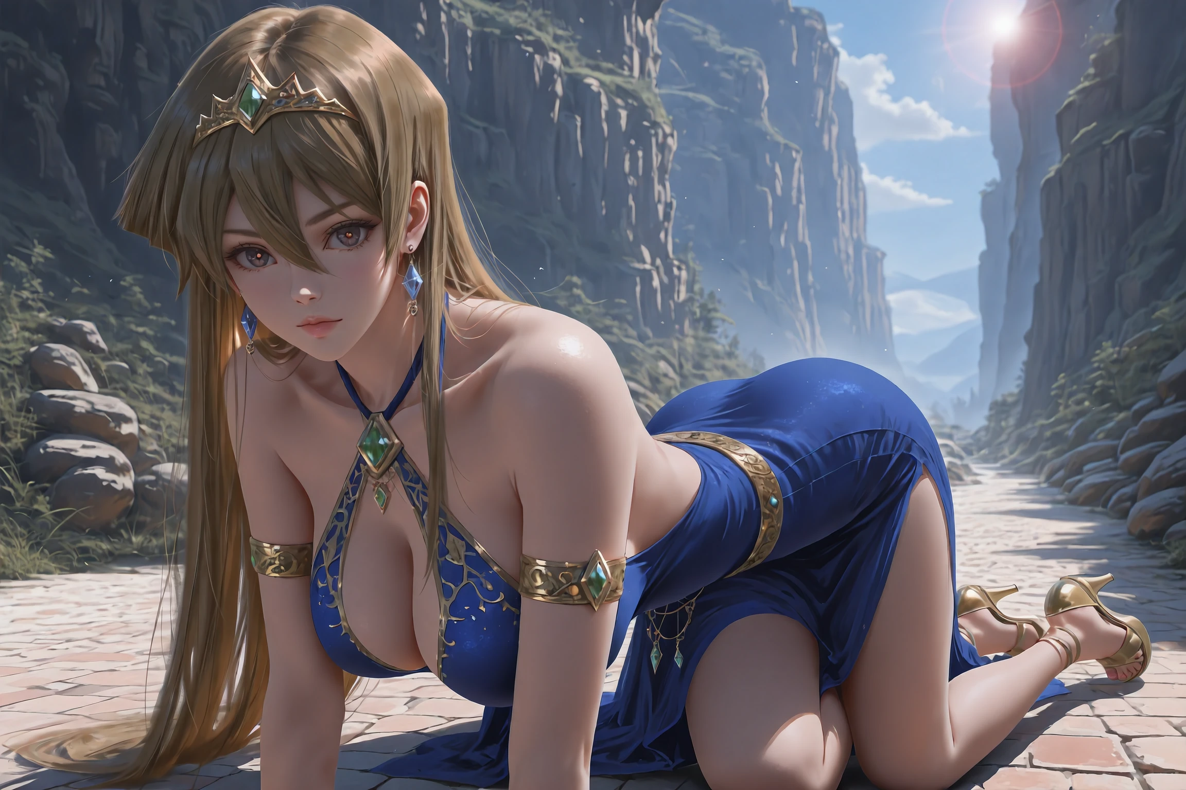 (3RD CLOTHING):Alexis Rhodes,tenjouin asuka,very long hair,brown eyes,hair between eyes,straight hair,brown hair,earrings,tiara,jewelry,dress,gold footwear,high heels,gold trim,bare shoulders,yellow footwear,sandals,halterneck,blue dress,bare legs,