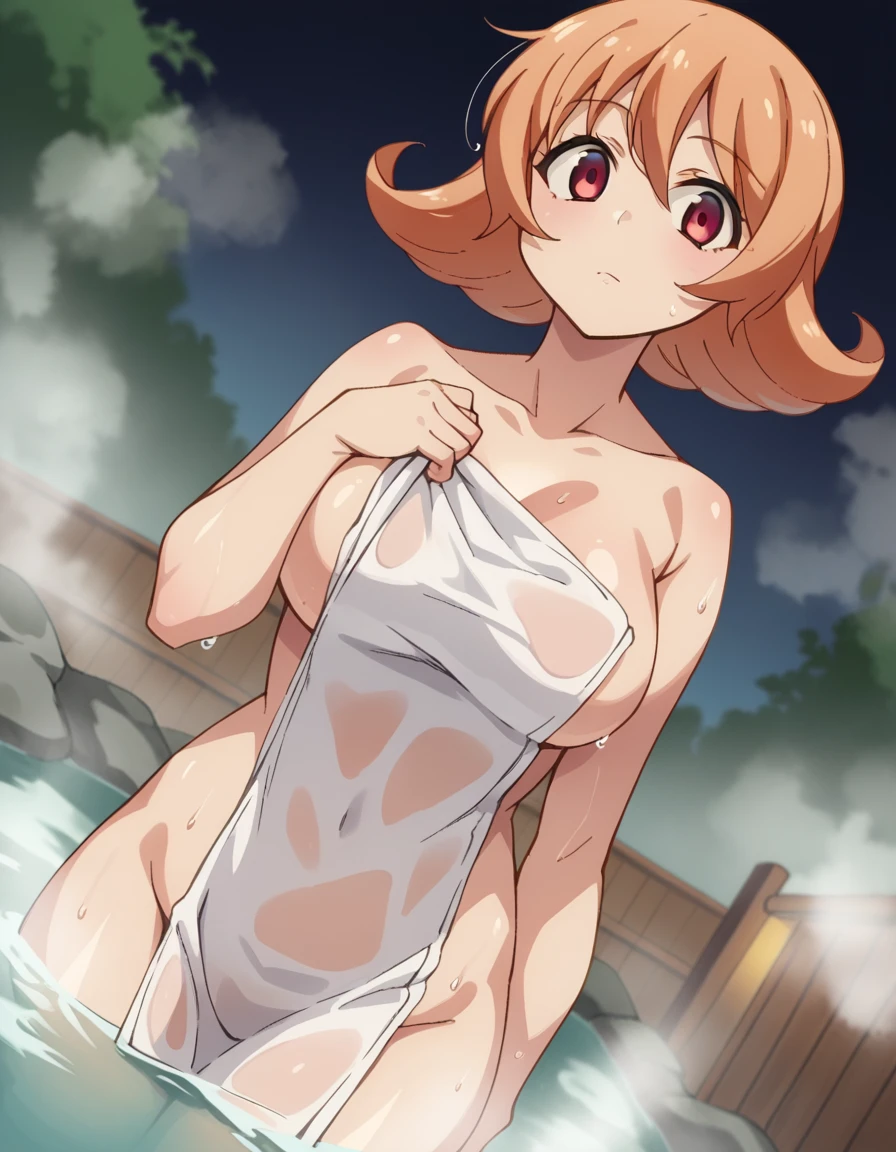 meidri, short hair, bangs, red eyes, orange hair, flipped hair,
