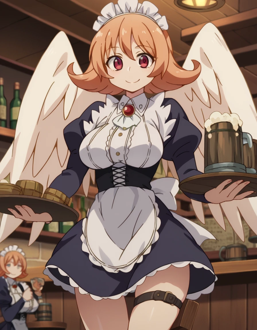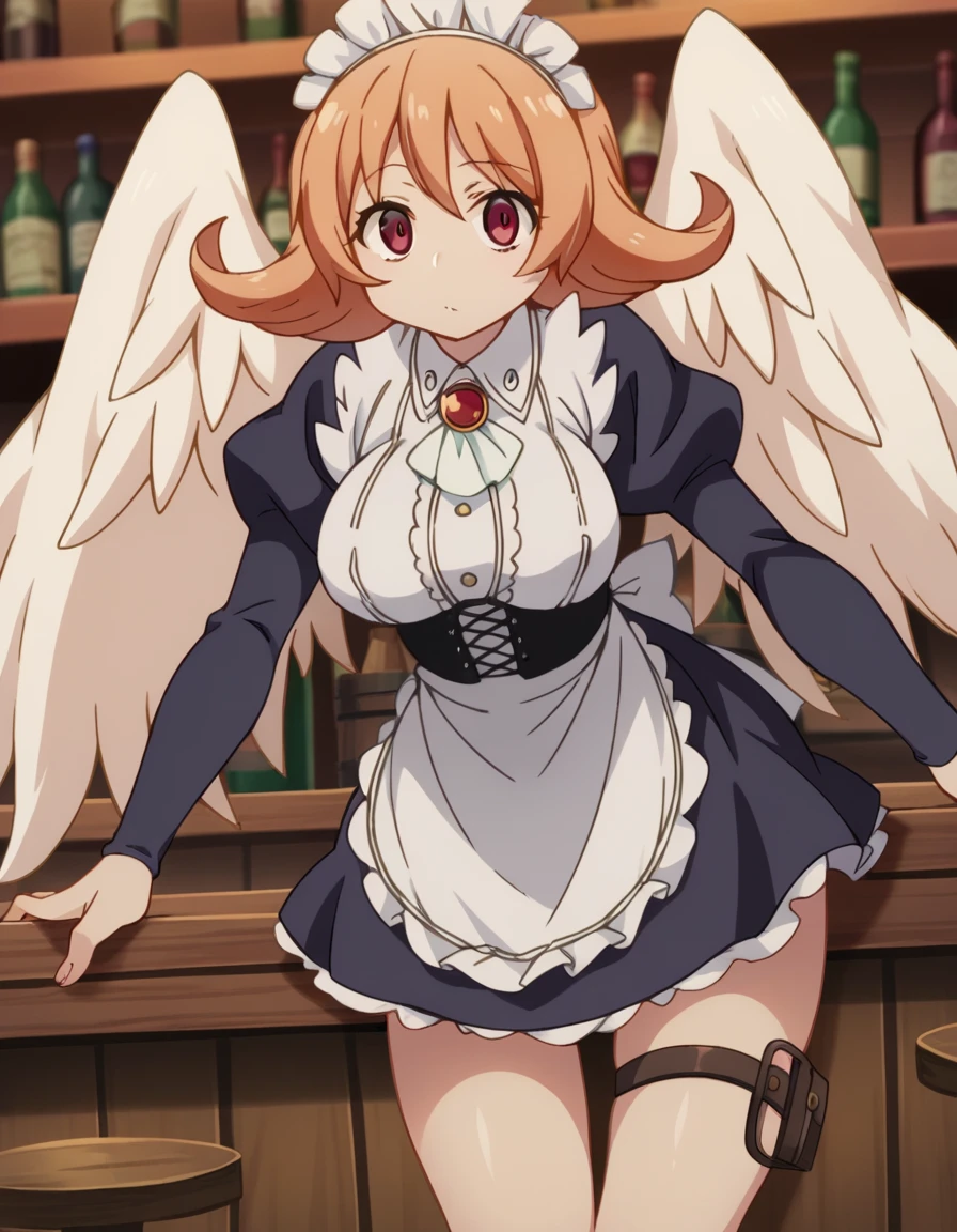 long sleeves, dress, jewelry, frills, wings, puffy sleeves, apron, maid, maid headdress, thigh strap, juliet sleeves, brooch, white apron, feathered wings, maid apron, puffy long sleeves, white wings,