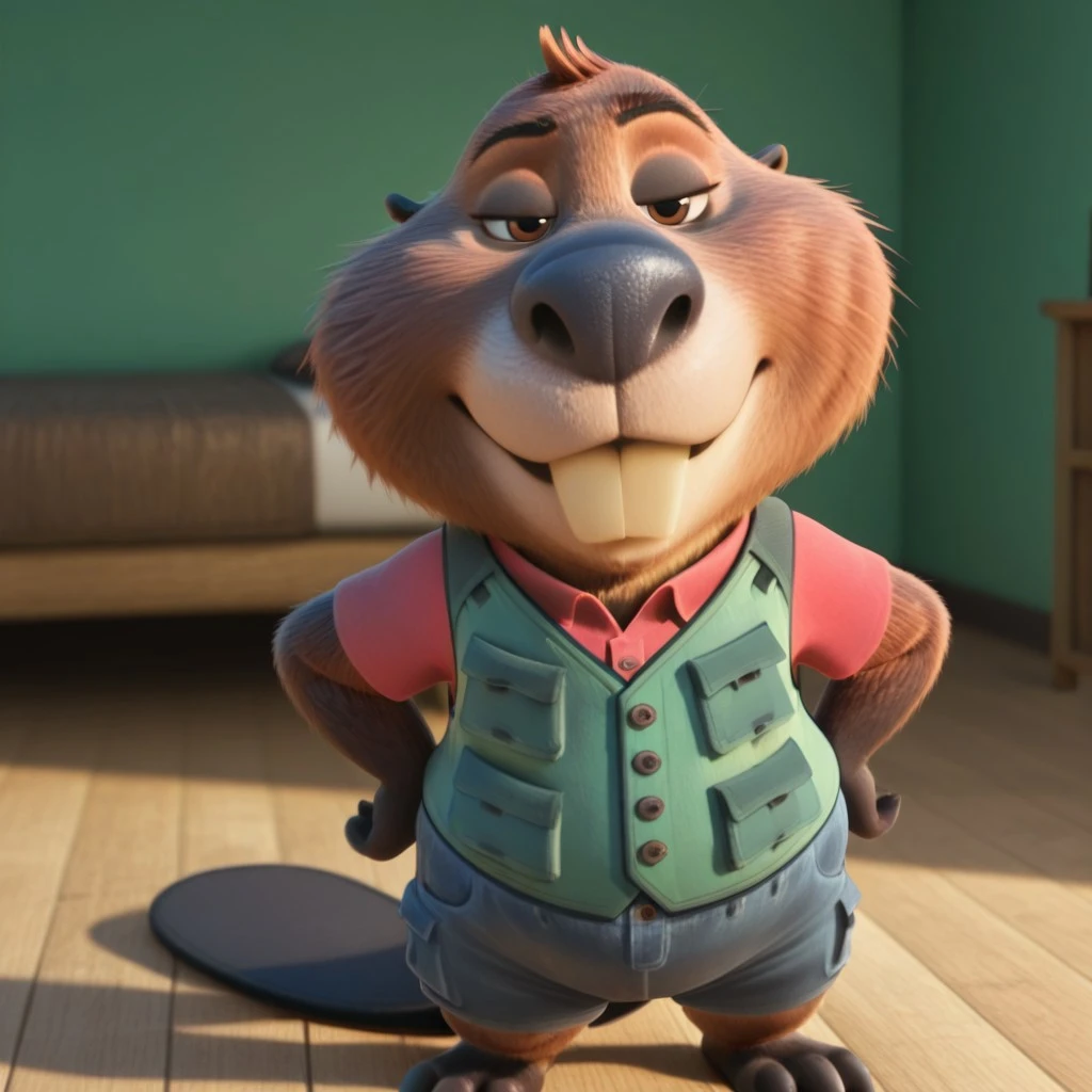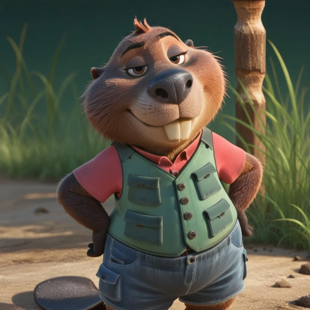nibbles, beaver, black nose, shortstack, 3D, blue shorts, red shirt, green vest, buck teeth, brown eyes, furry, female, tiny ears, brown fur, flat tail,