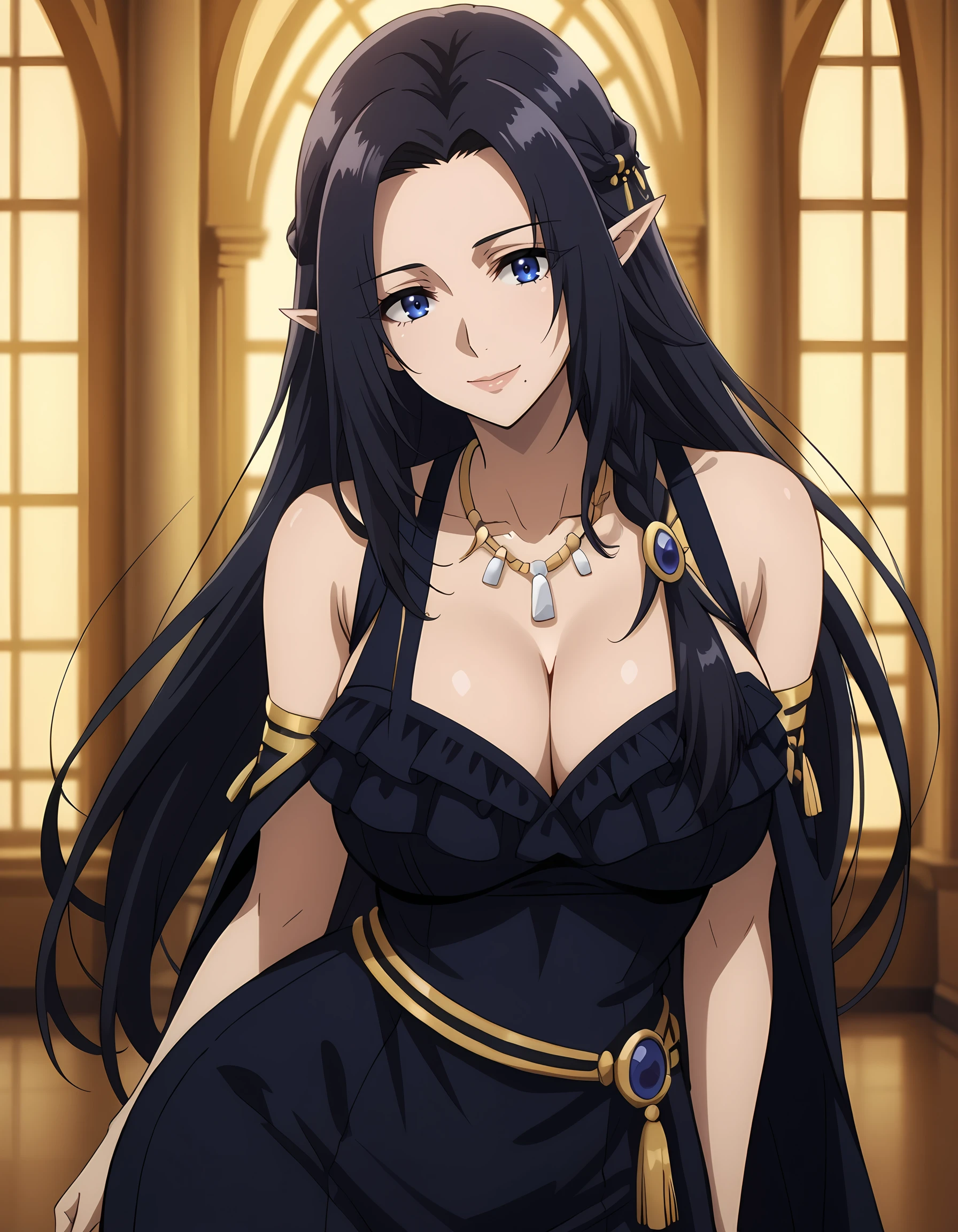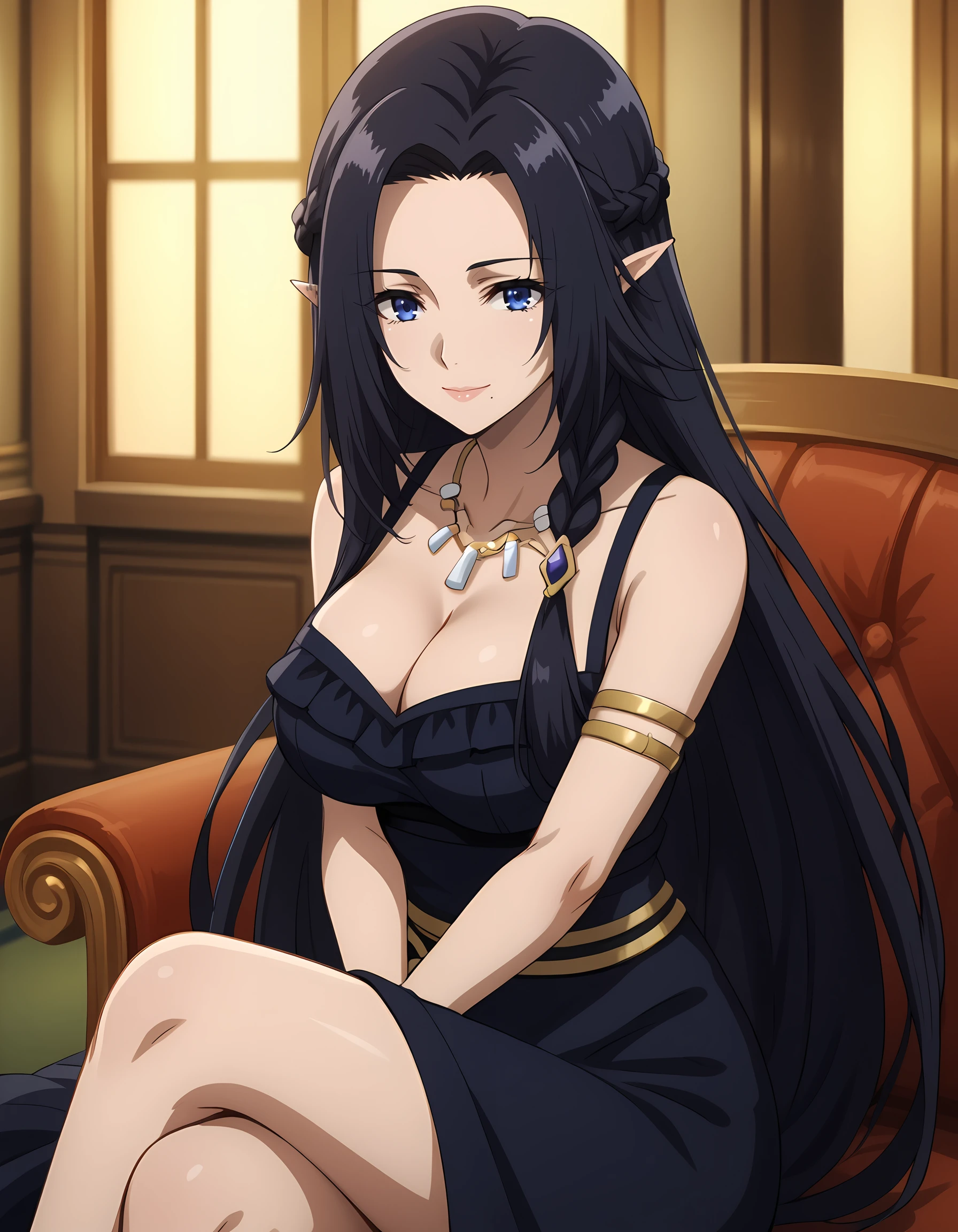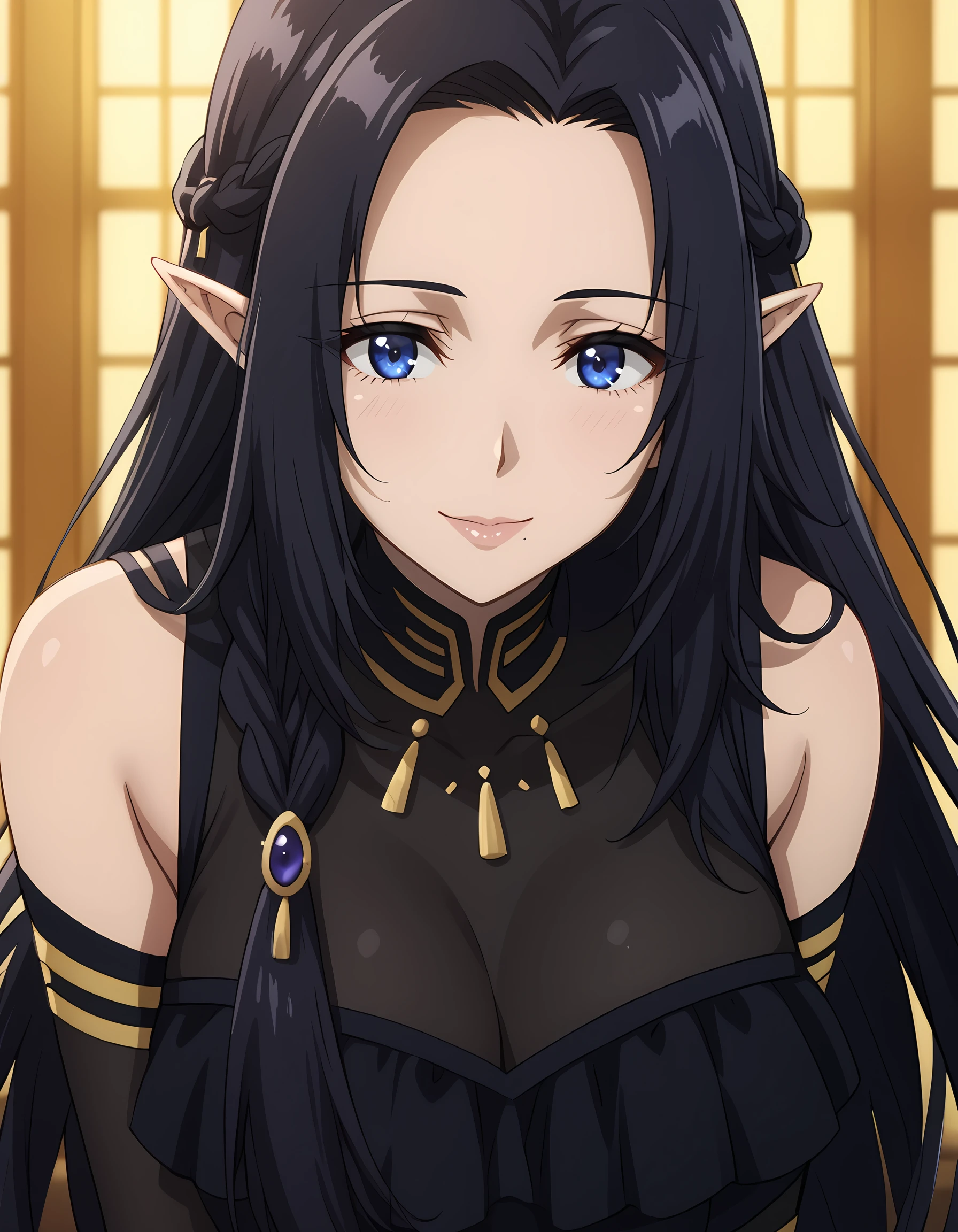 gamma_eminence, pointy ears, elf, black hair, blue eyes, long hair, braid, mole under mouth