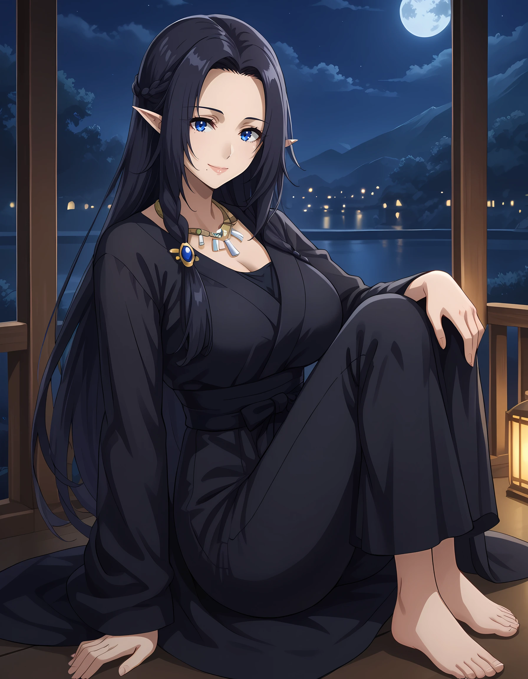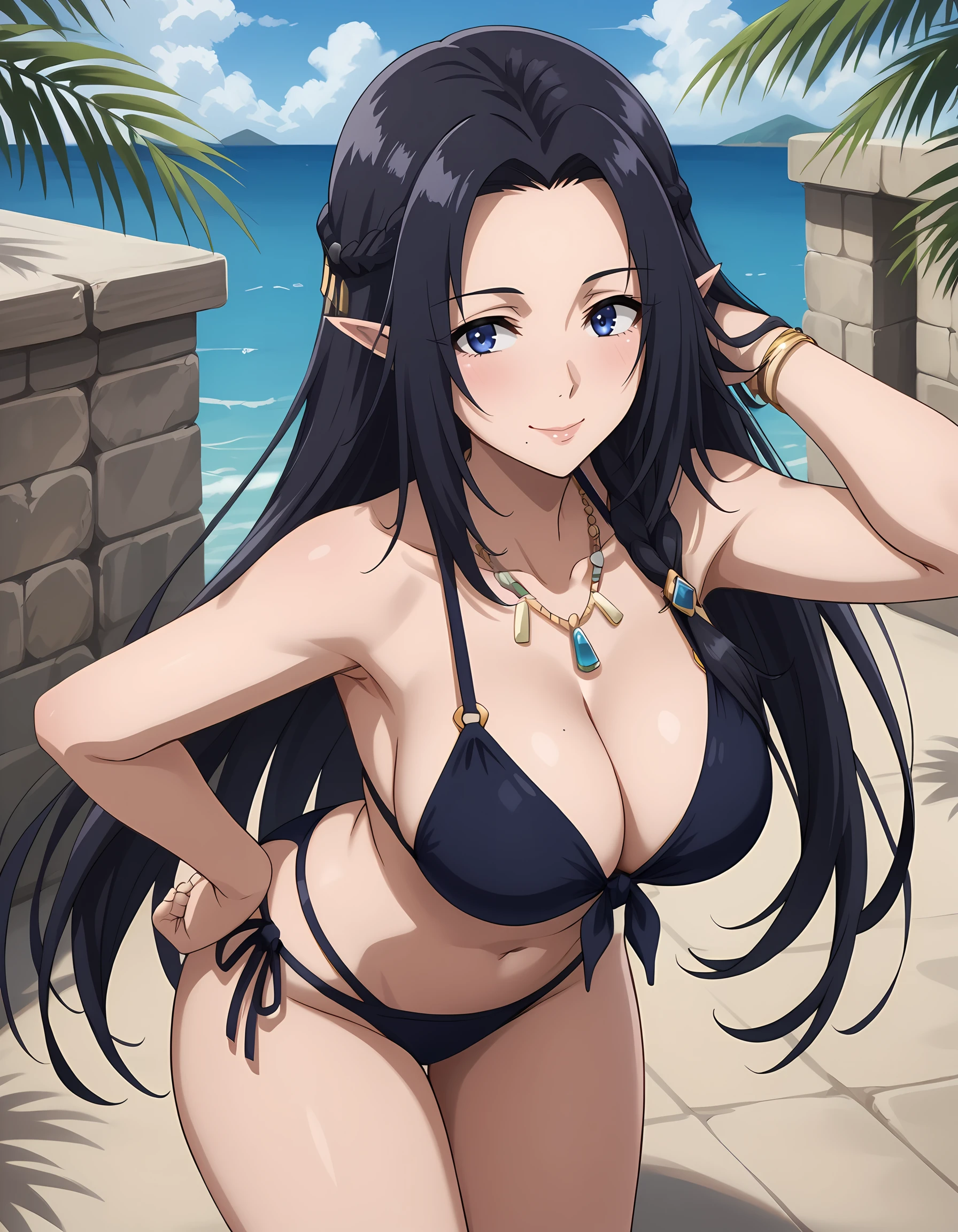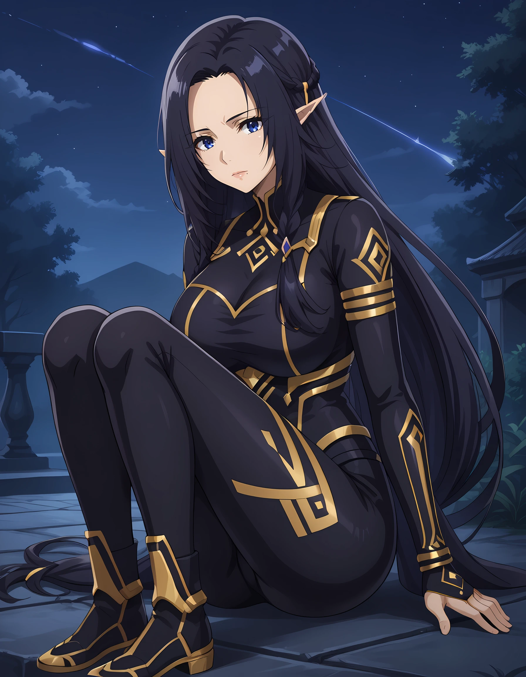 gamma_eminence, pointy ears, elf, black hair, blue eyes, long hair, braid, mole under mouth