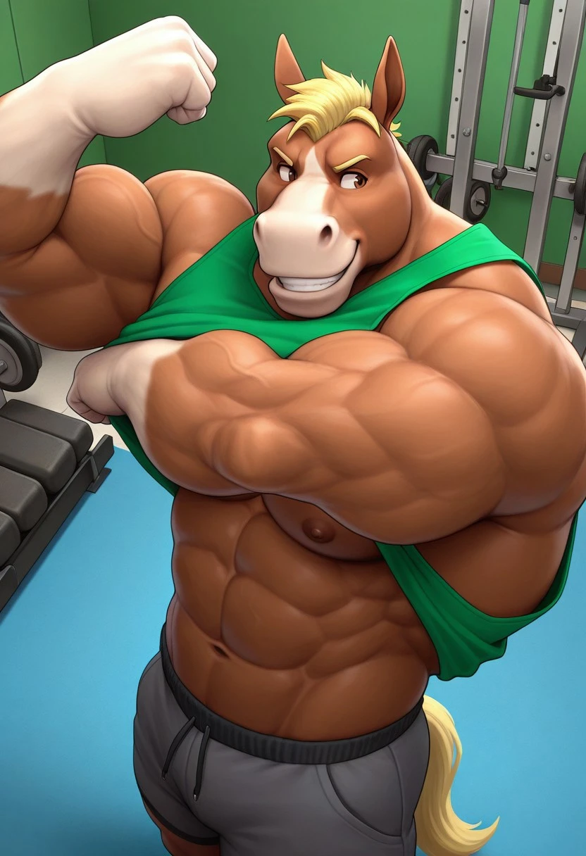 Outfit Prompts: "green tank top, grey shorts, blue speedo, hooves"