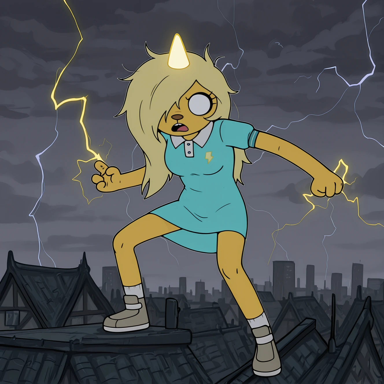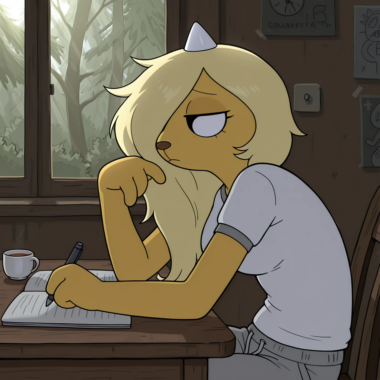 6r0nwyn_AT, anthro, solo, female, medium breasts, swept bangs, hair over eye, blonde hair, yellow body, slim, 4 fingers, long hair, brown nose, round eyes, 1 horn, eyelashes,