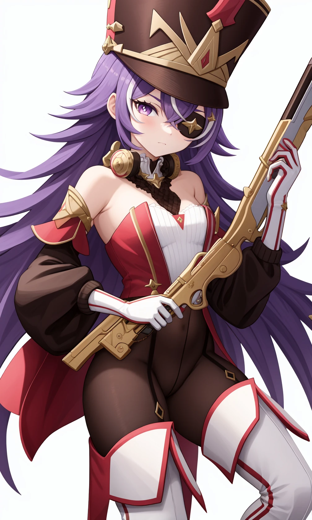 chevreuse, long hair, purple hair, purple eyes, hat, eyepatch, gloves, white gloves, bangs, hair between eyes, detached sleeves