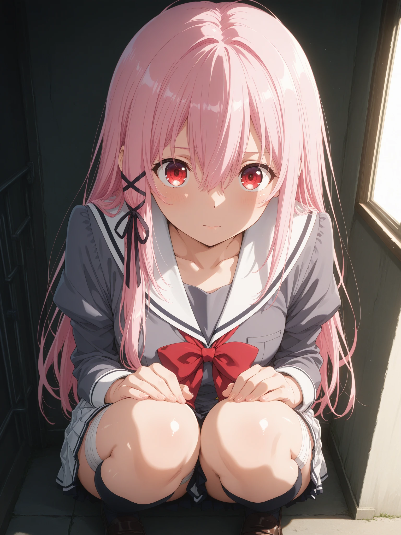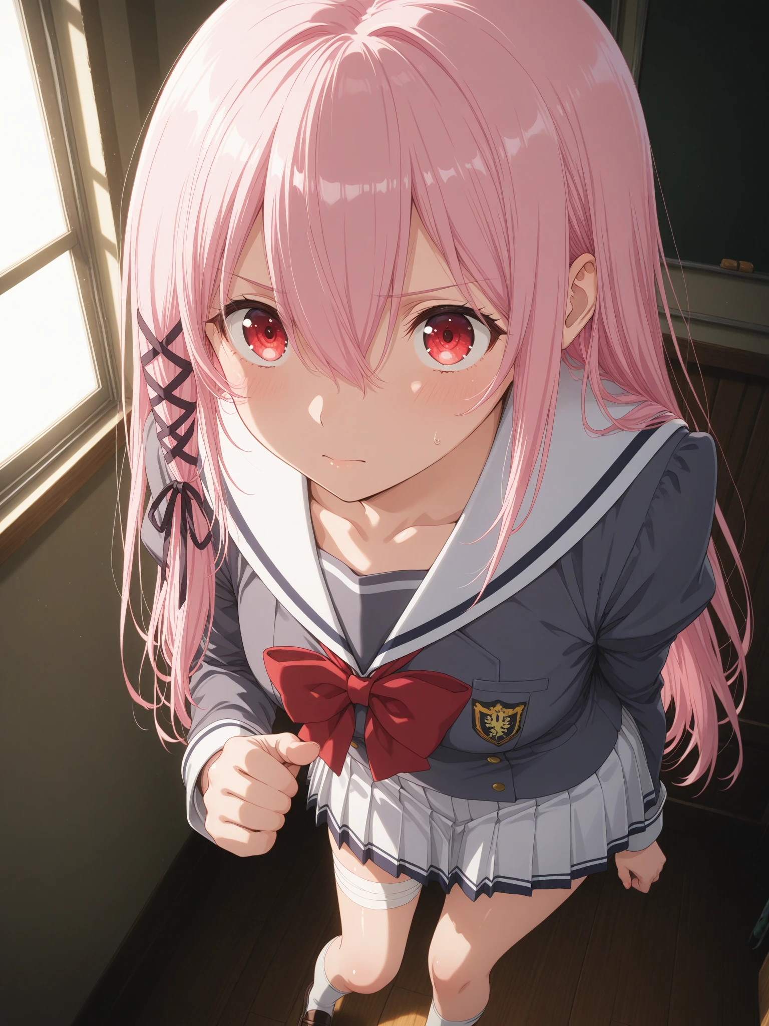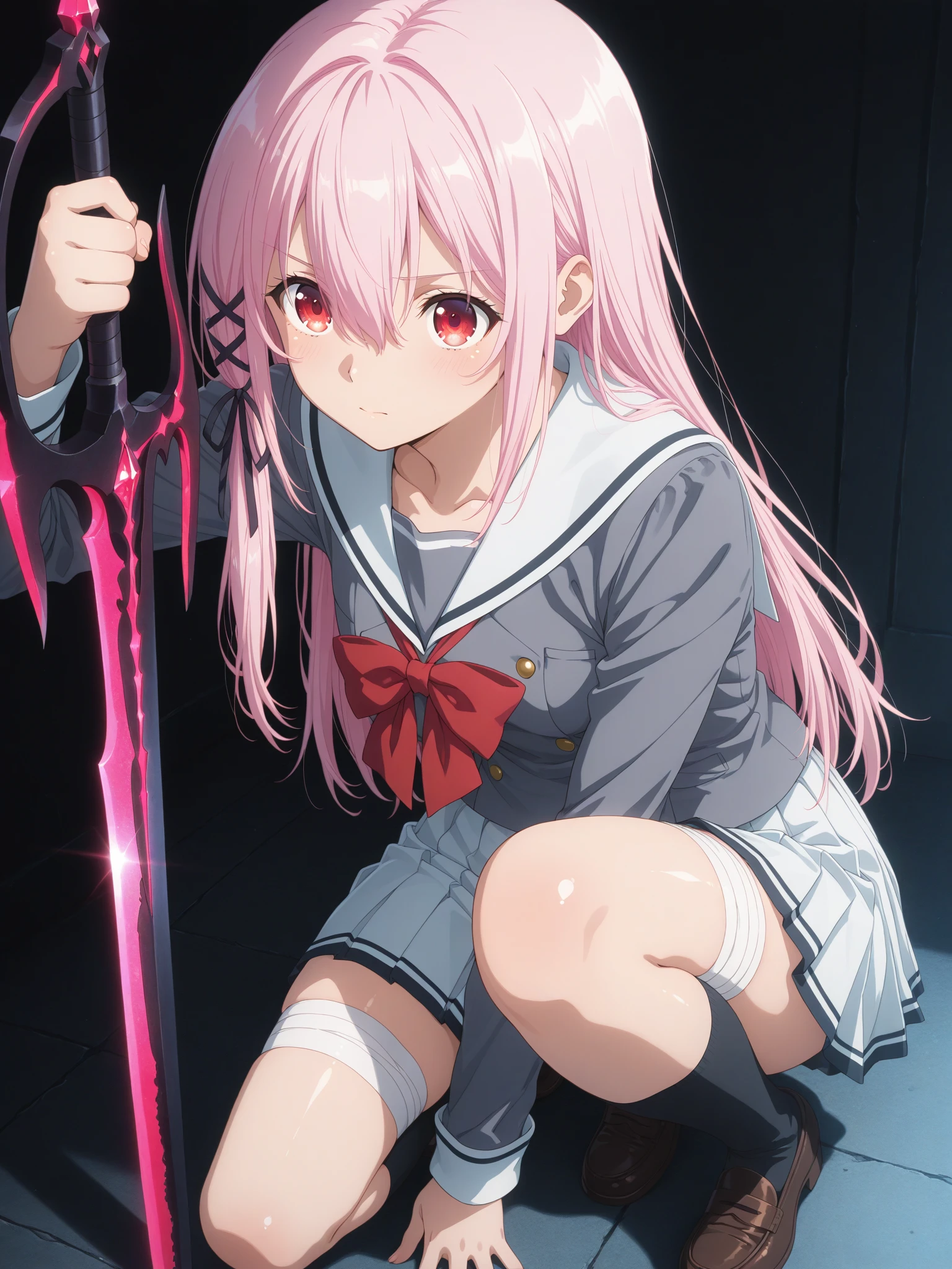 Uniform: (KisaraUniform, red eyes, pink hair, hair between eyes, long hair, sidelocks, hair ribbon), (school uniform, sailor collar, bow, pleated skirt, bandaged thigh, black knee socks, loafers)