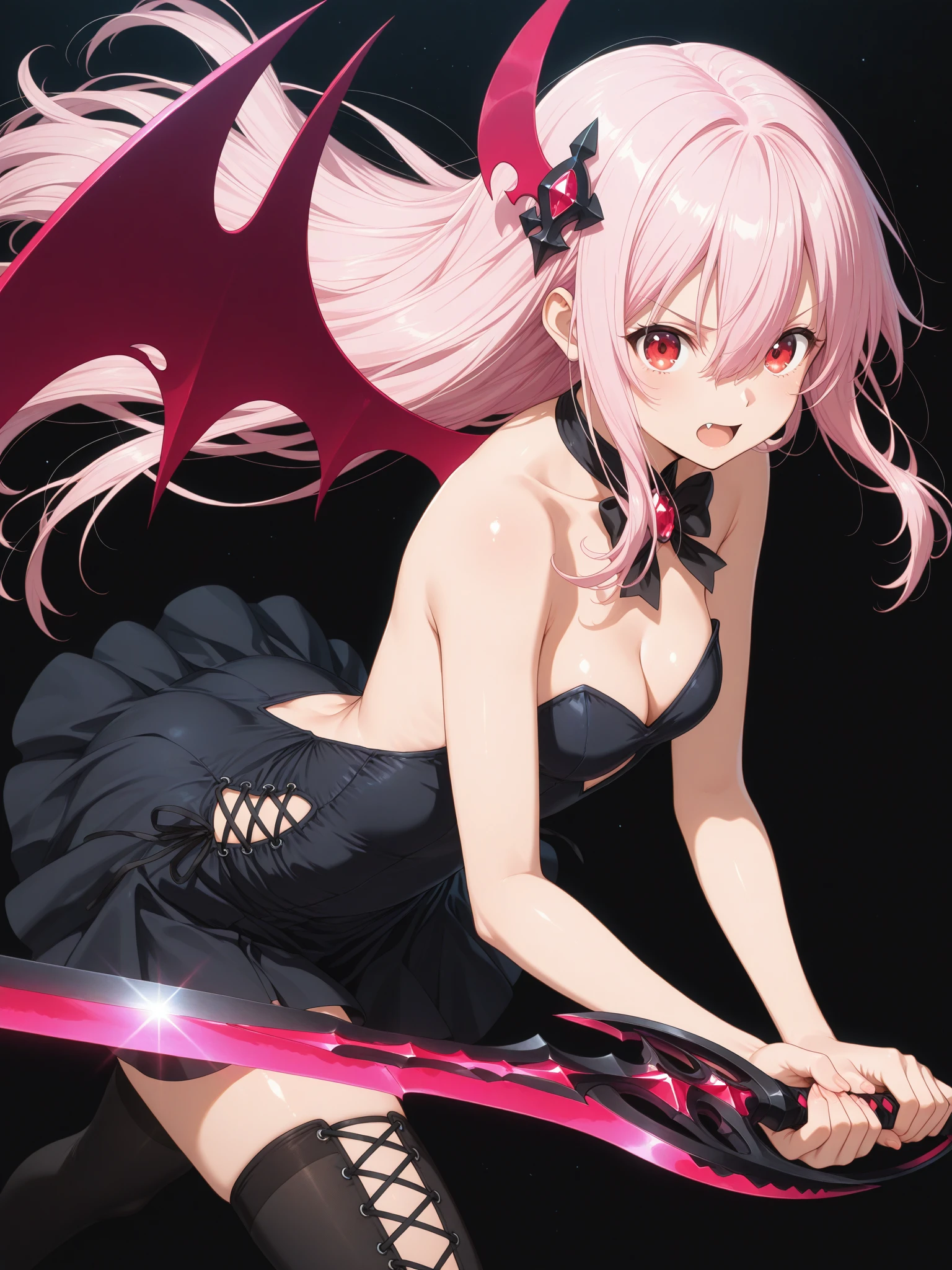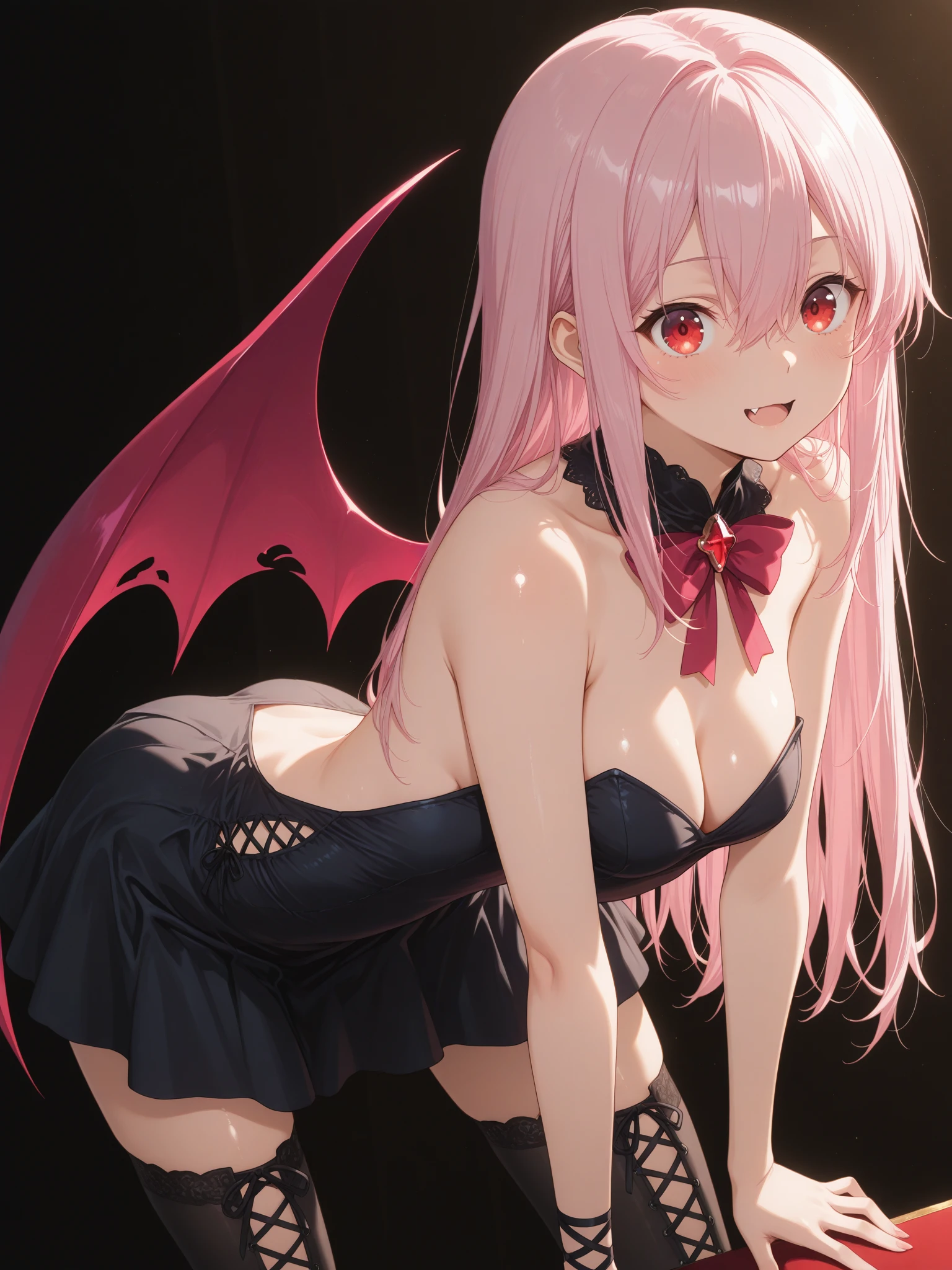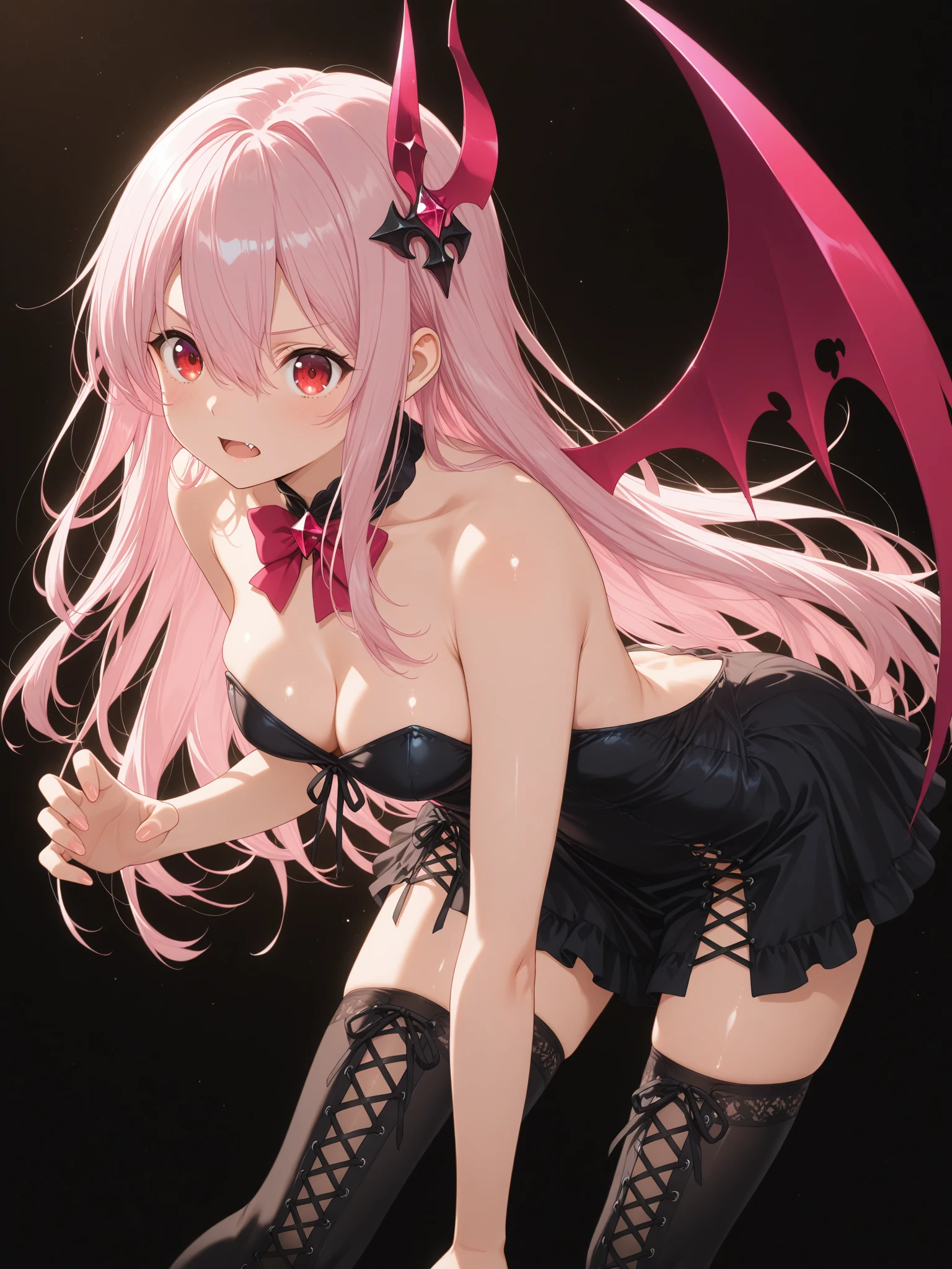 Demon: (KisaraDemon, fang, red eyes, pink hair, hair between eyes, long hair, sidelocks, hair ornament), (strapless dress, backless dress, short dress, cross-laced skirt, black laces, bare shoulders, bare arms, cleavage cutout, one wing, bowtie, cross-laced gloves, cross-laced thighhighs, black thighhighs)